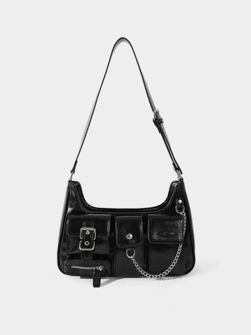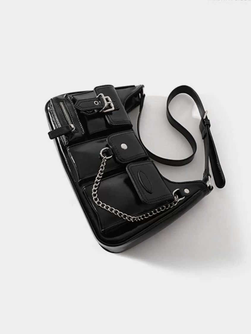 個性多口袋黑色亮皮機車包