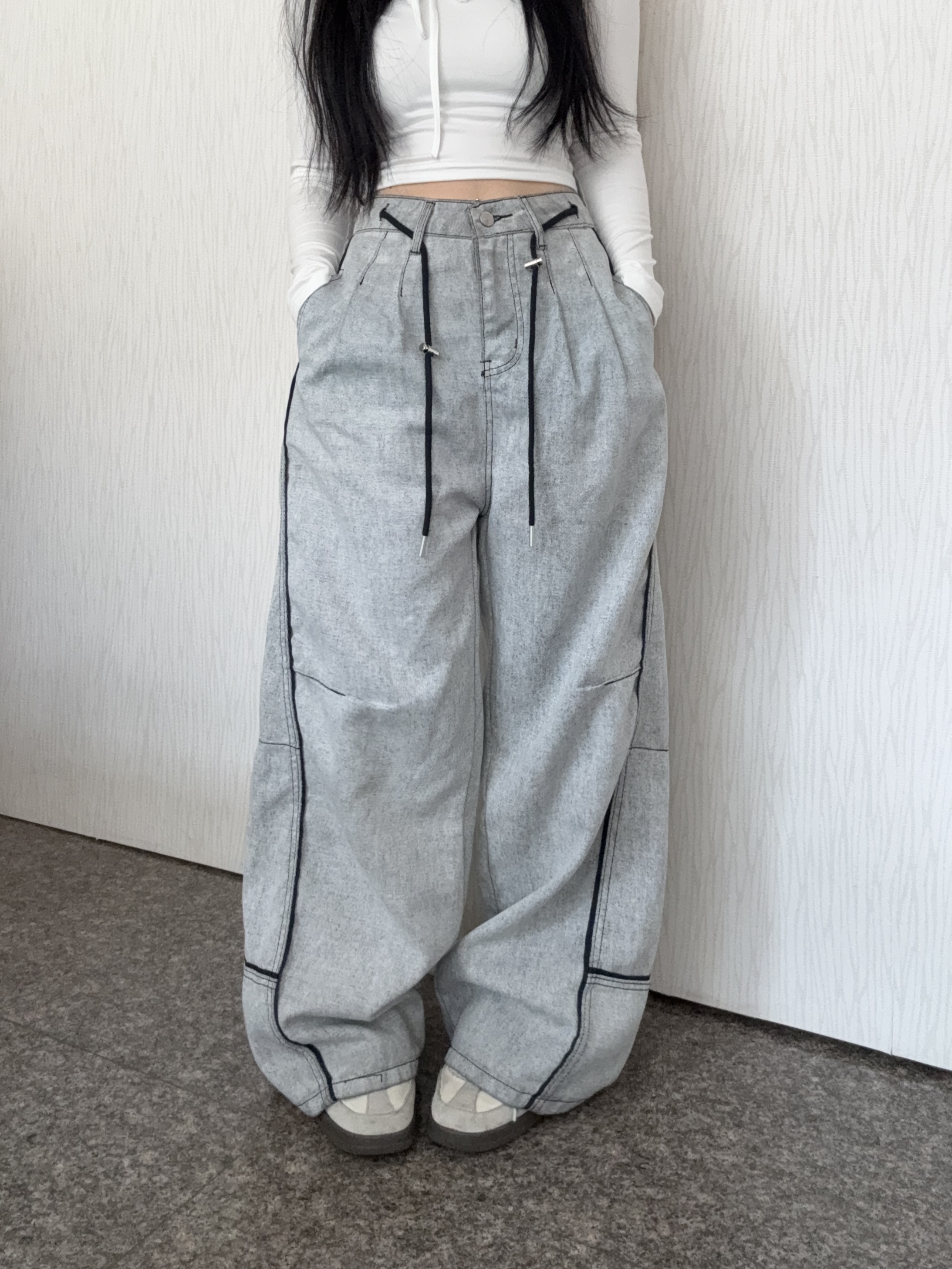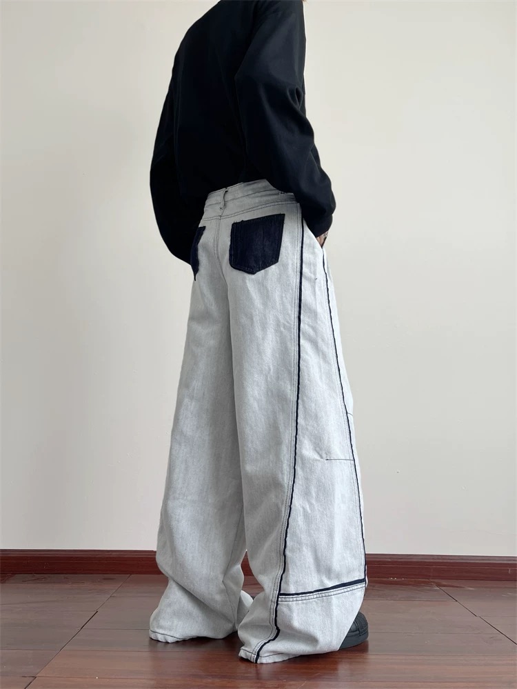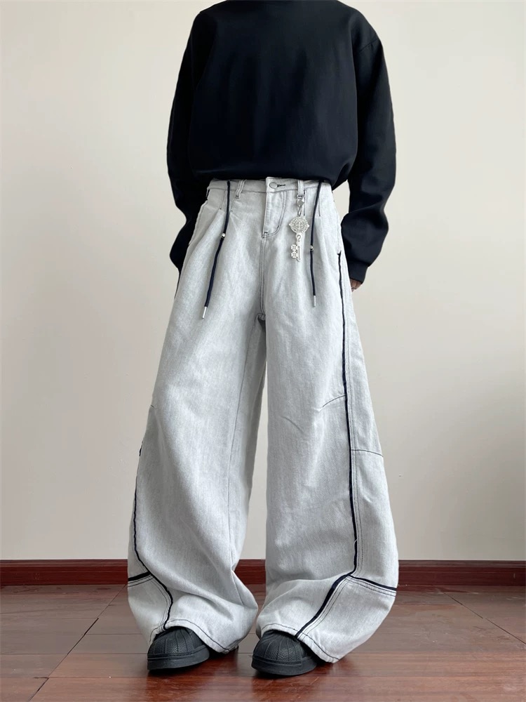 [男款]街頭風斜毛邊工裝口袋高腰牛仔寬褲