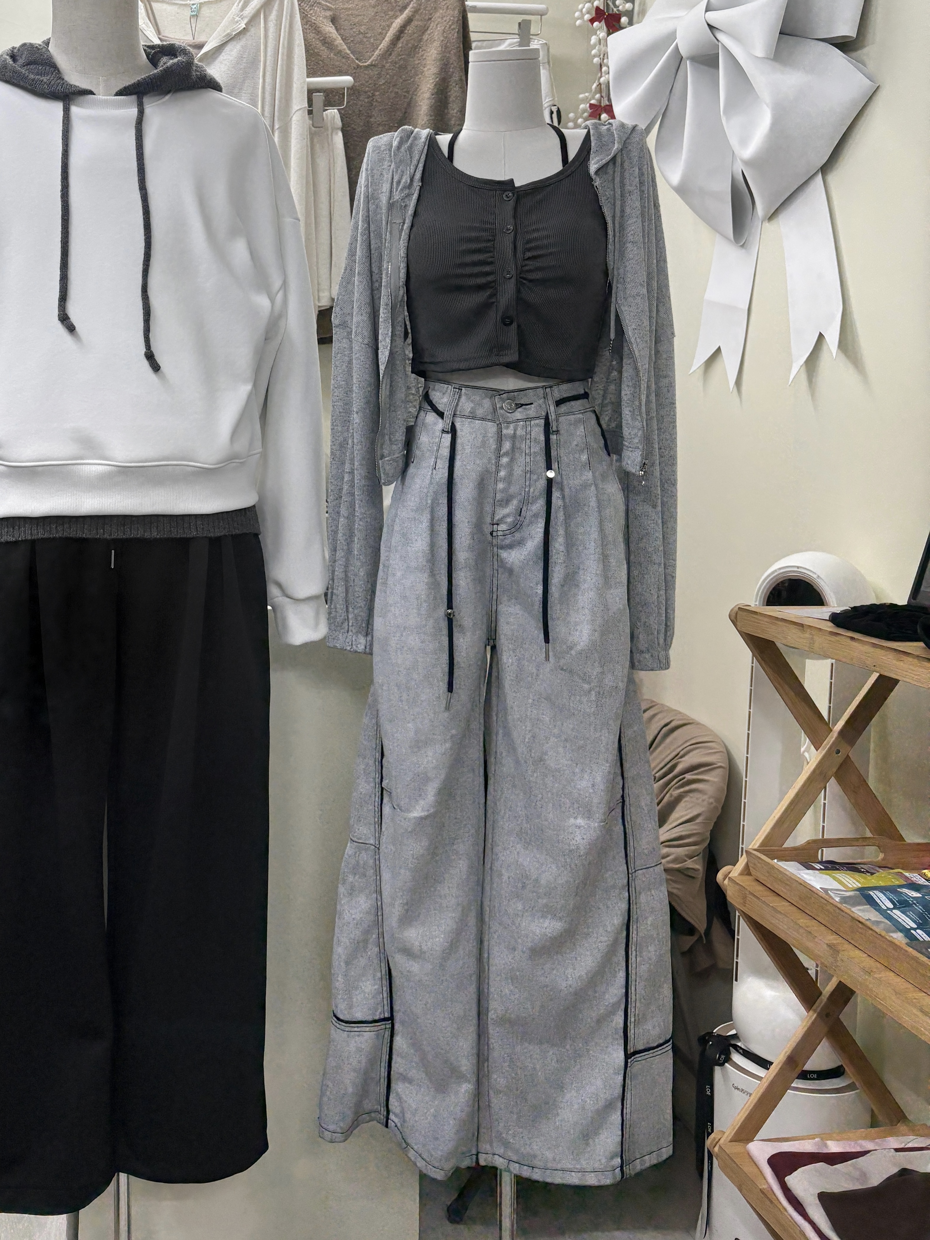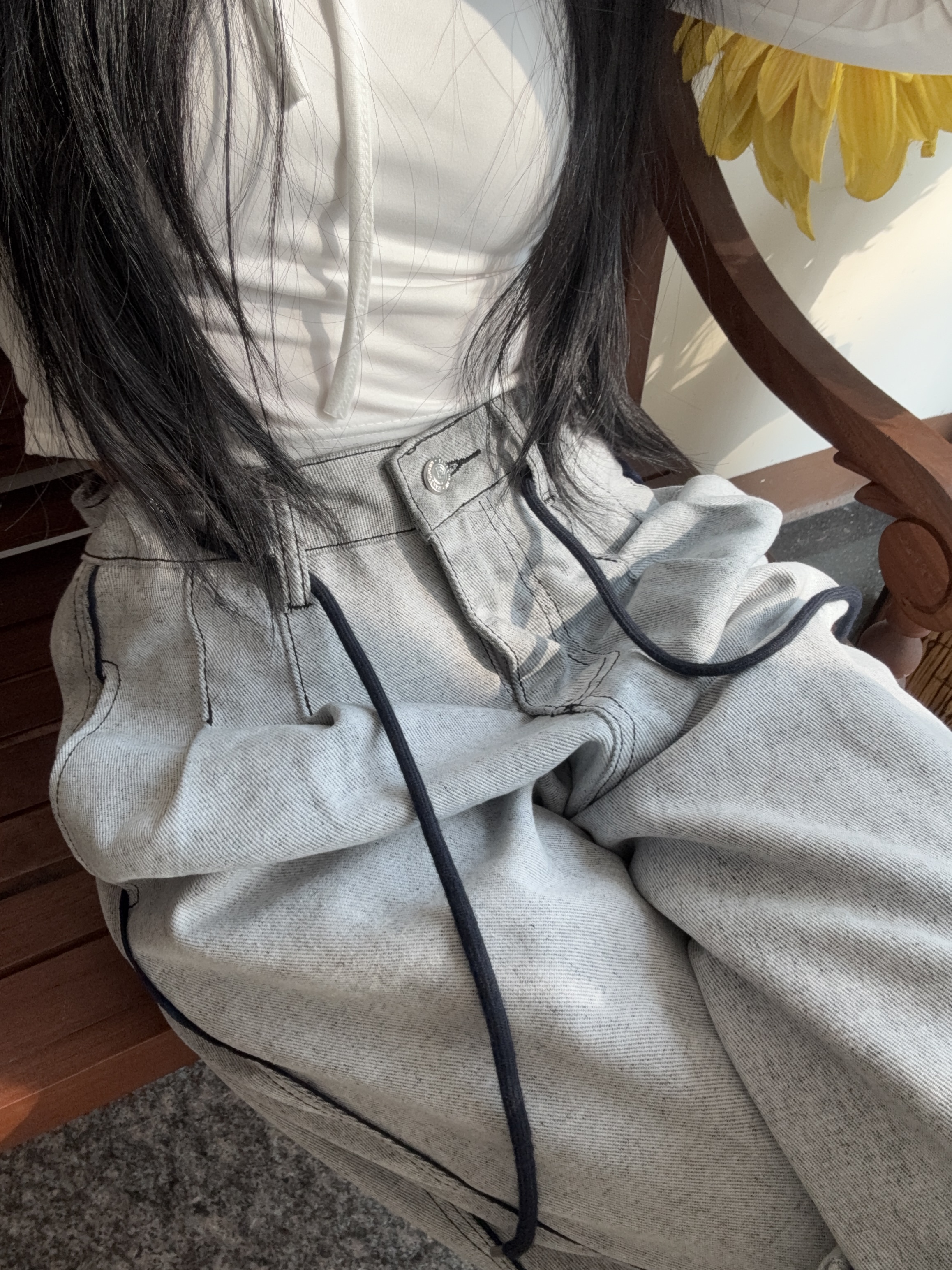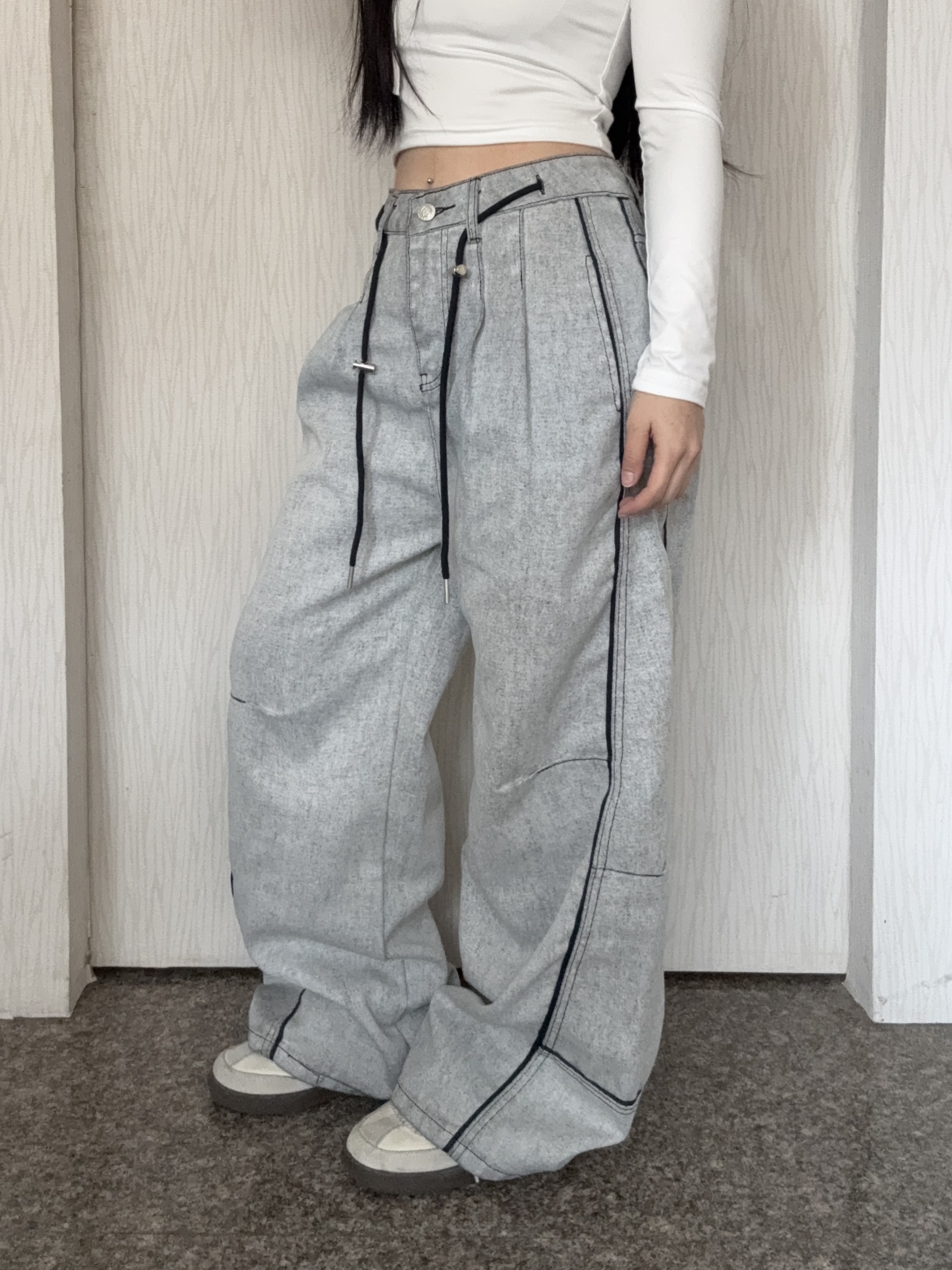 [男款]街頭風斜毛邊工裝口袋高腰牛仔寬褲