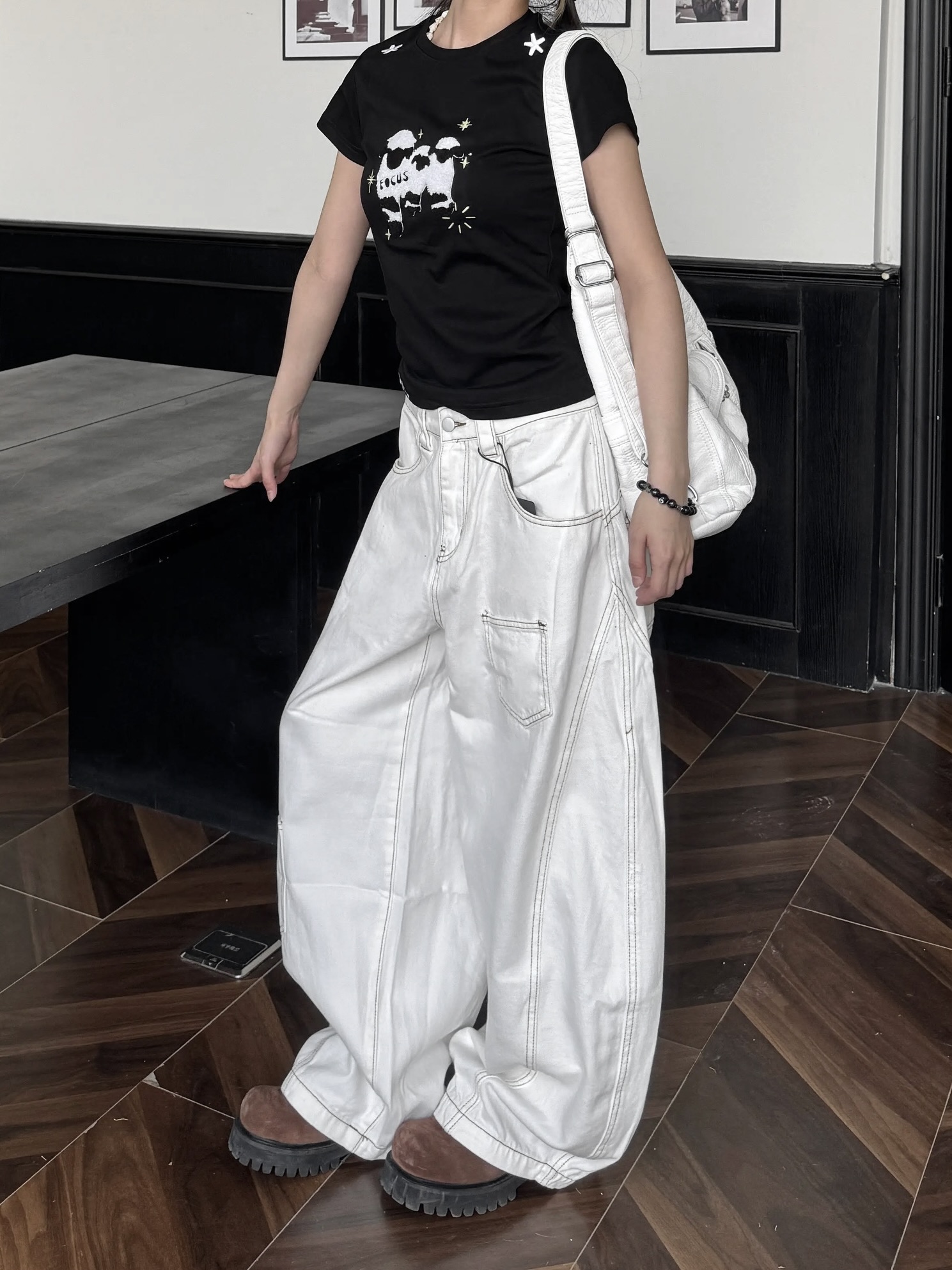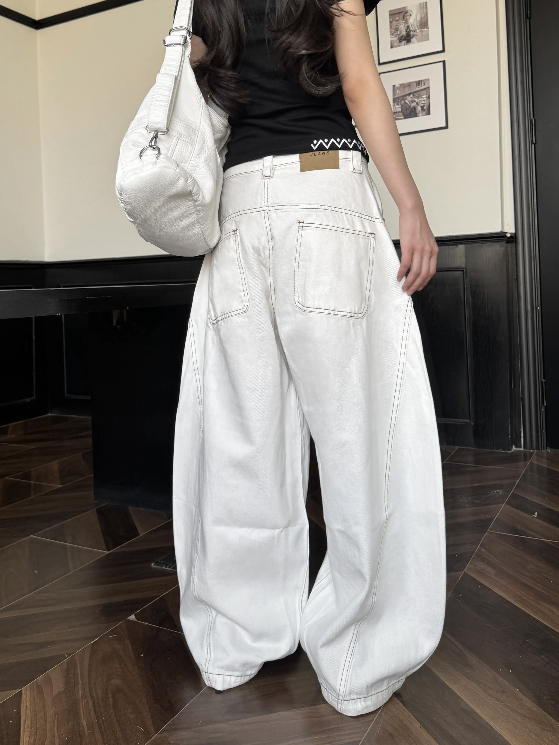 焦糖車線口袋白色牛仔彎刀褲