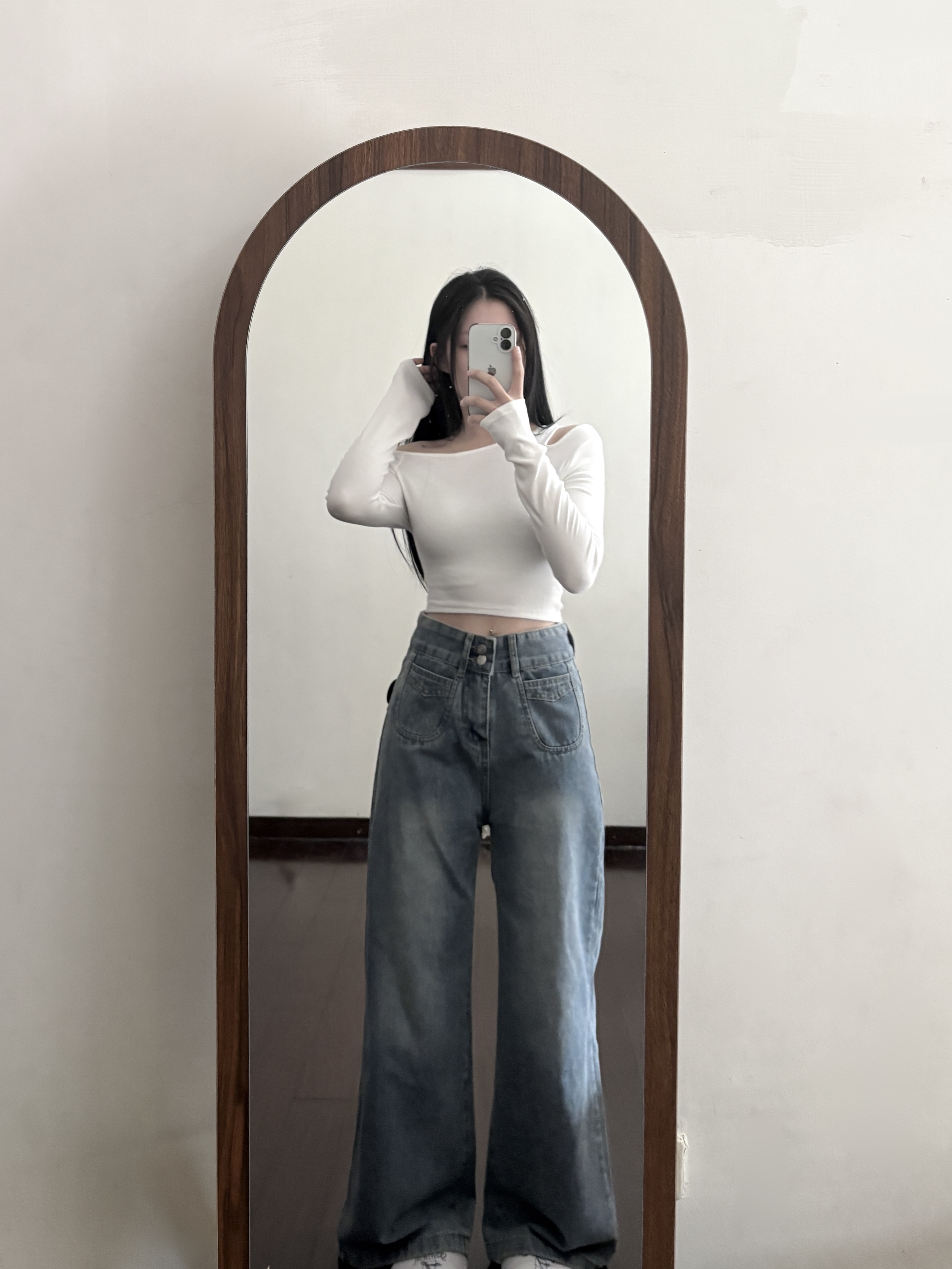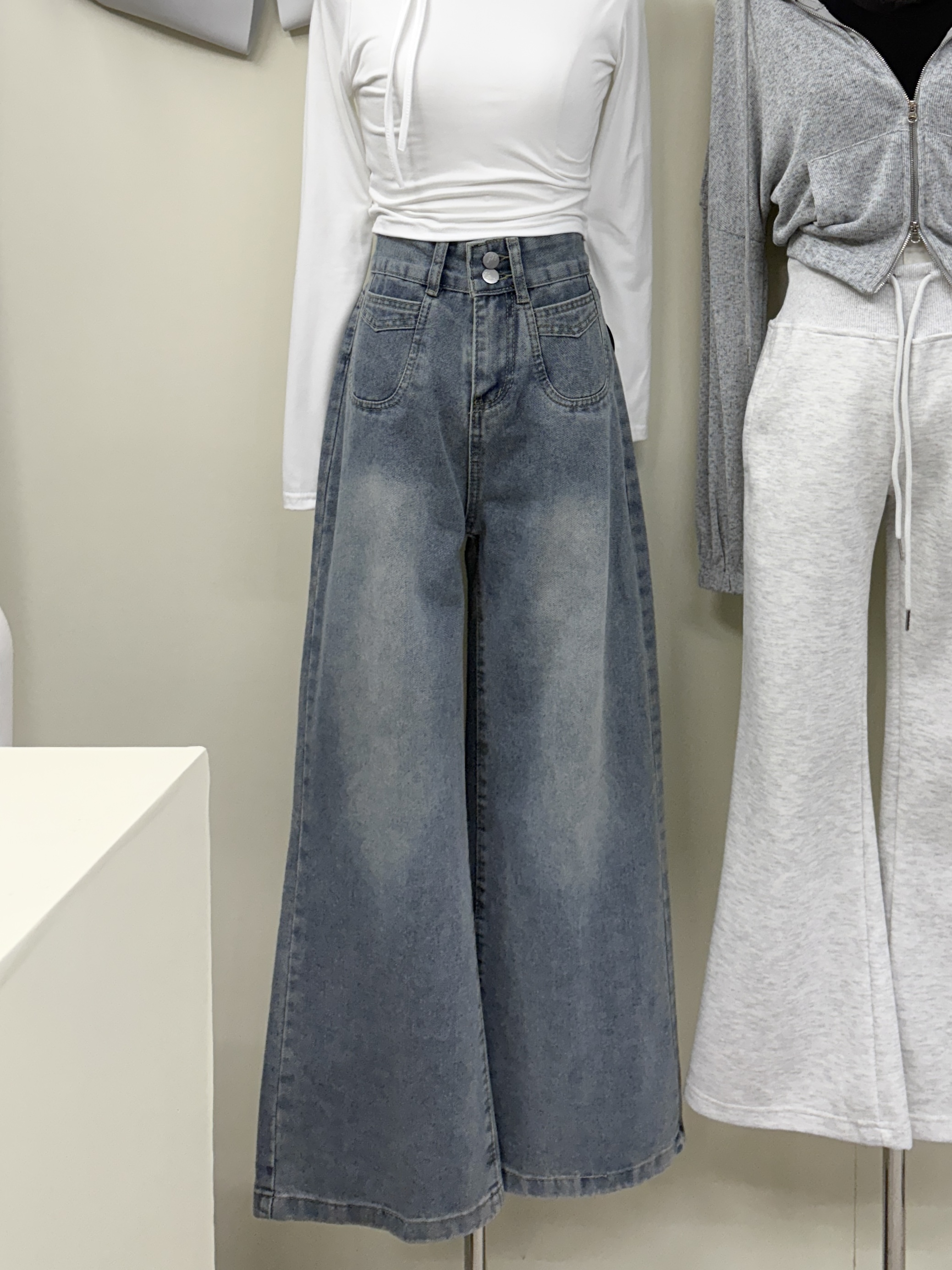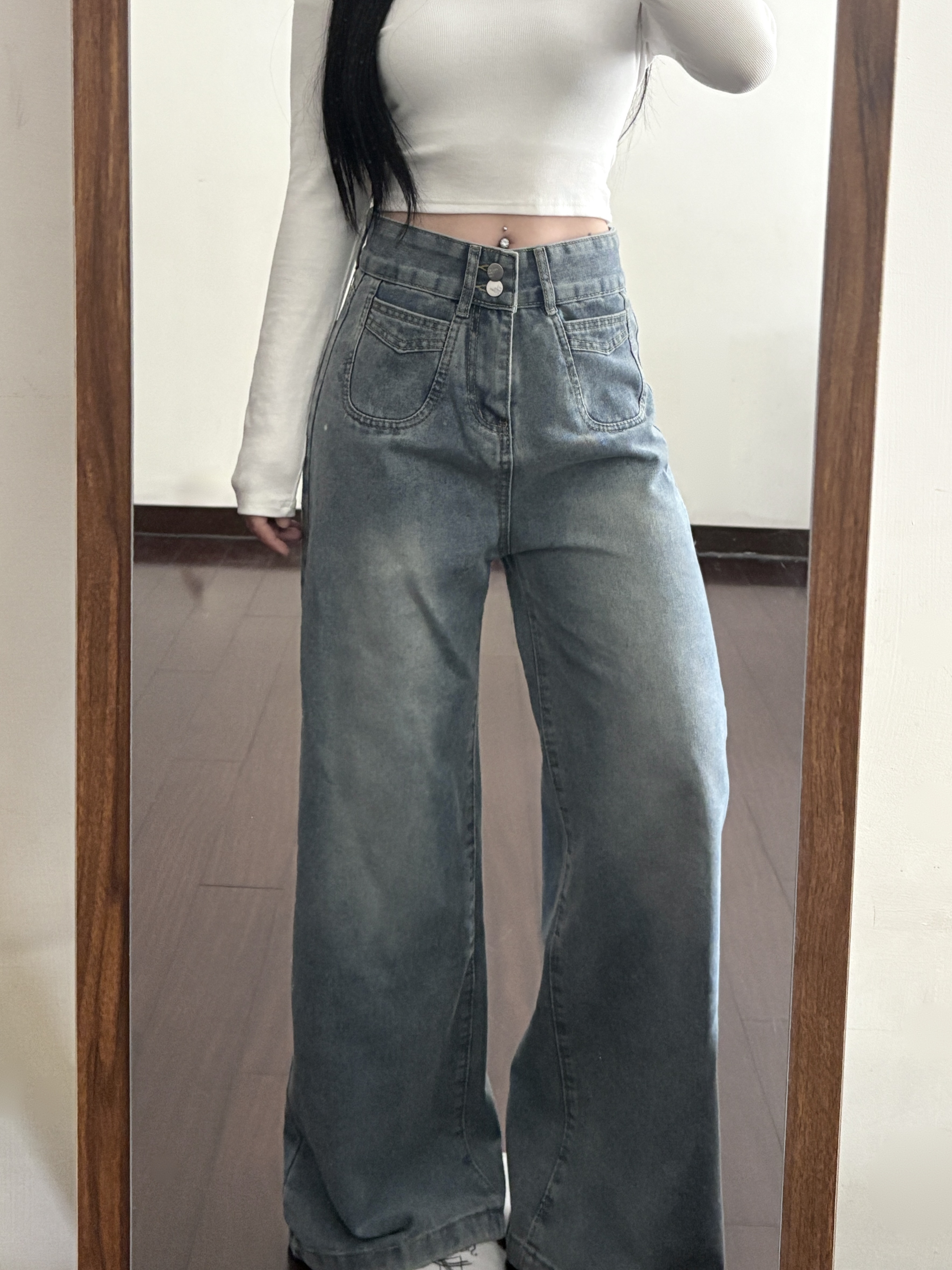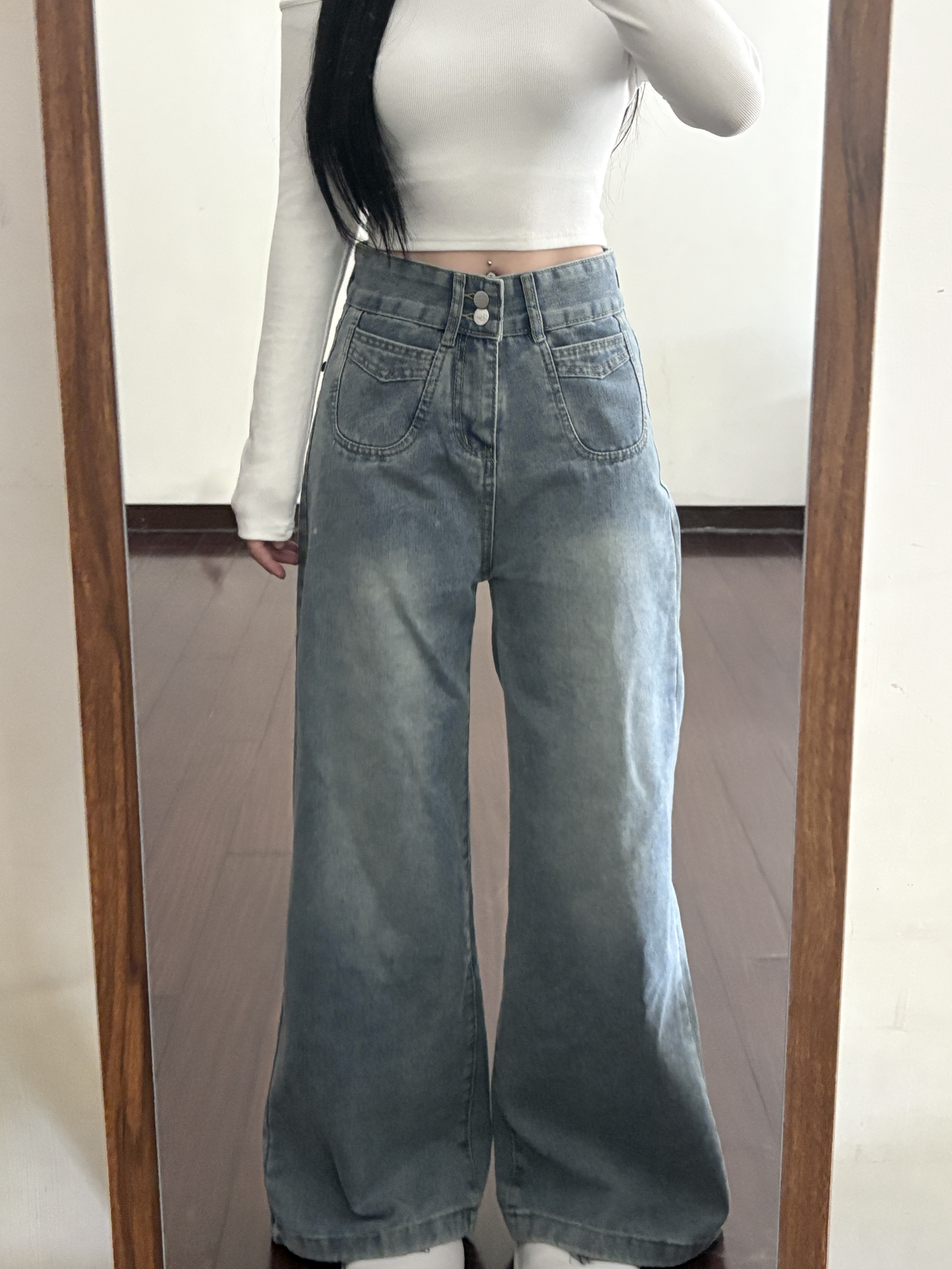 雙釦方口袋淺藍色高腰直筒牛仔寬褲