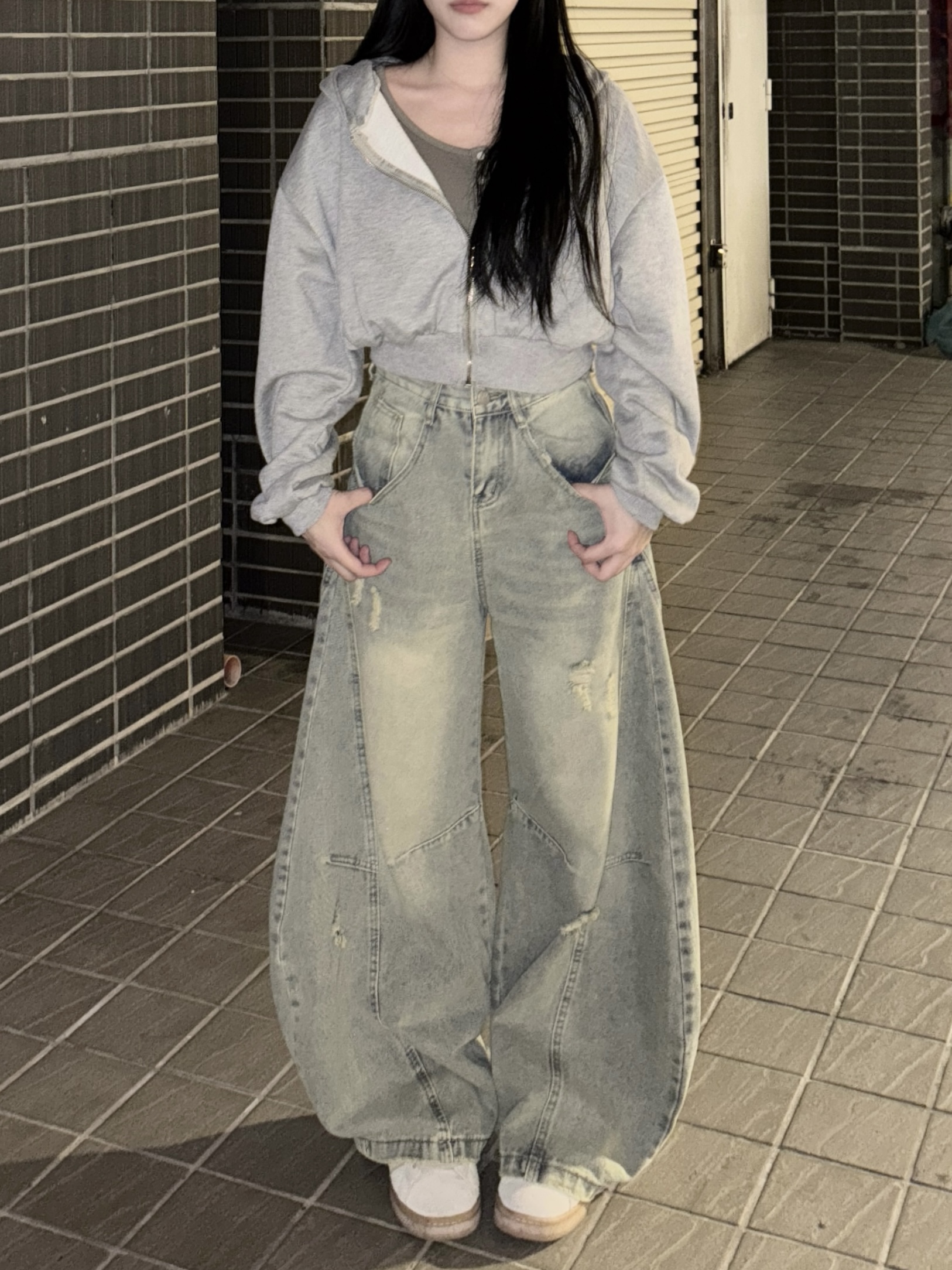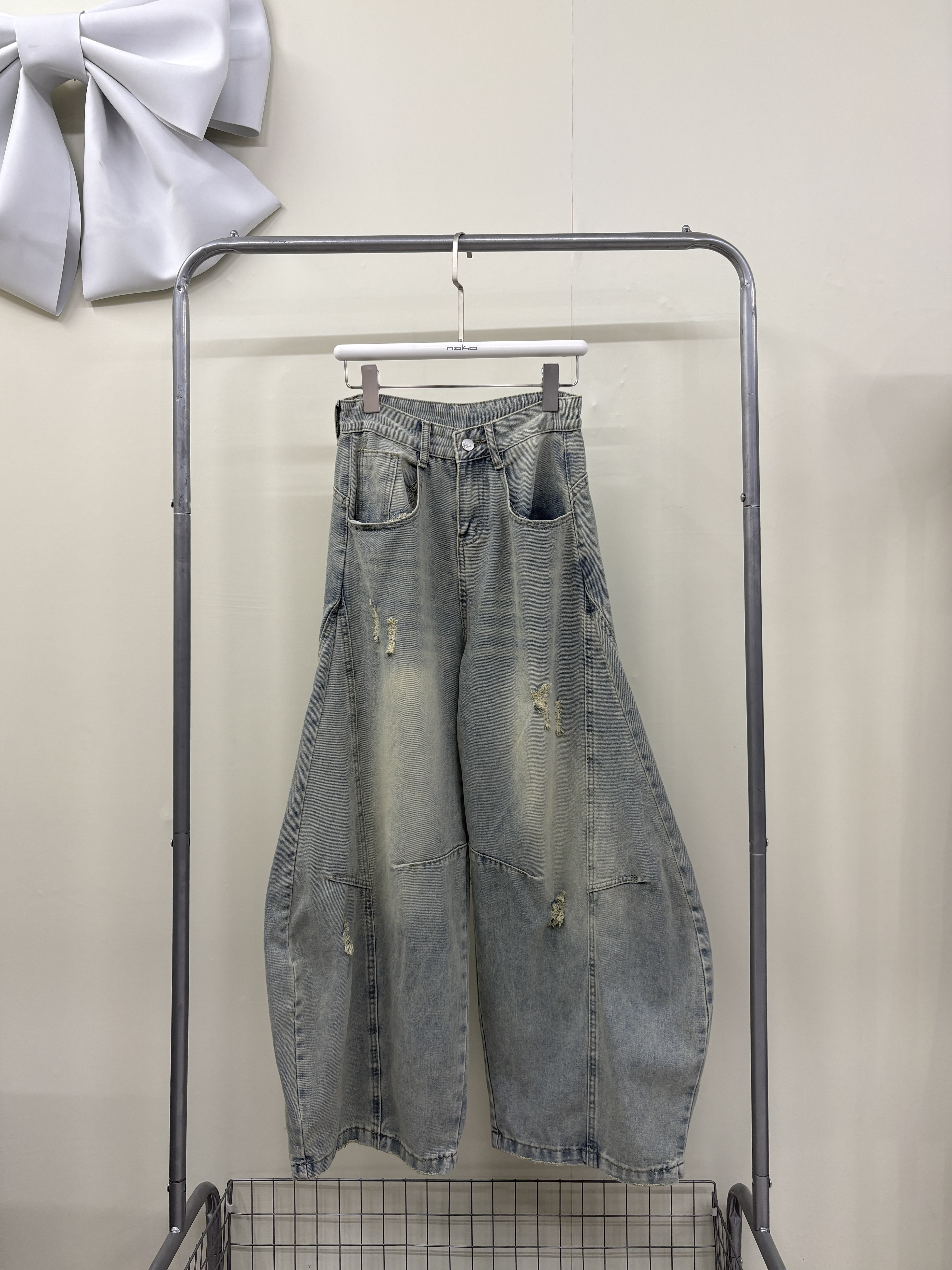 復古刷黃破舊牛仔彎刀褲