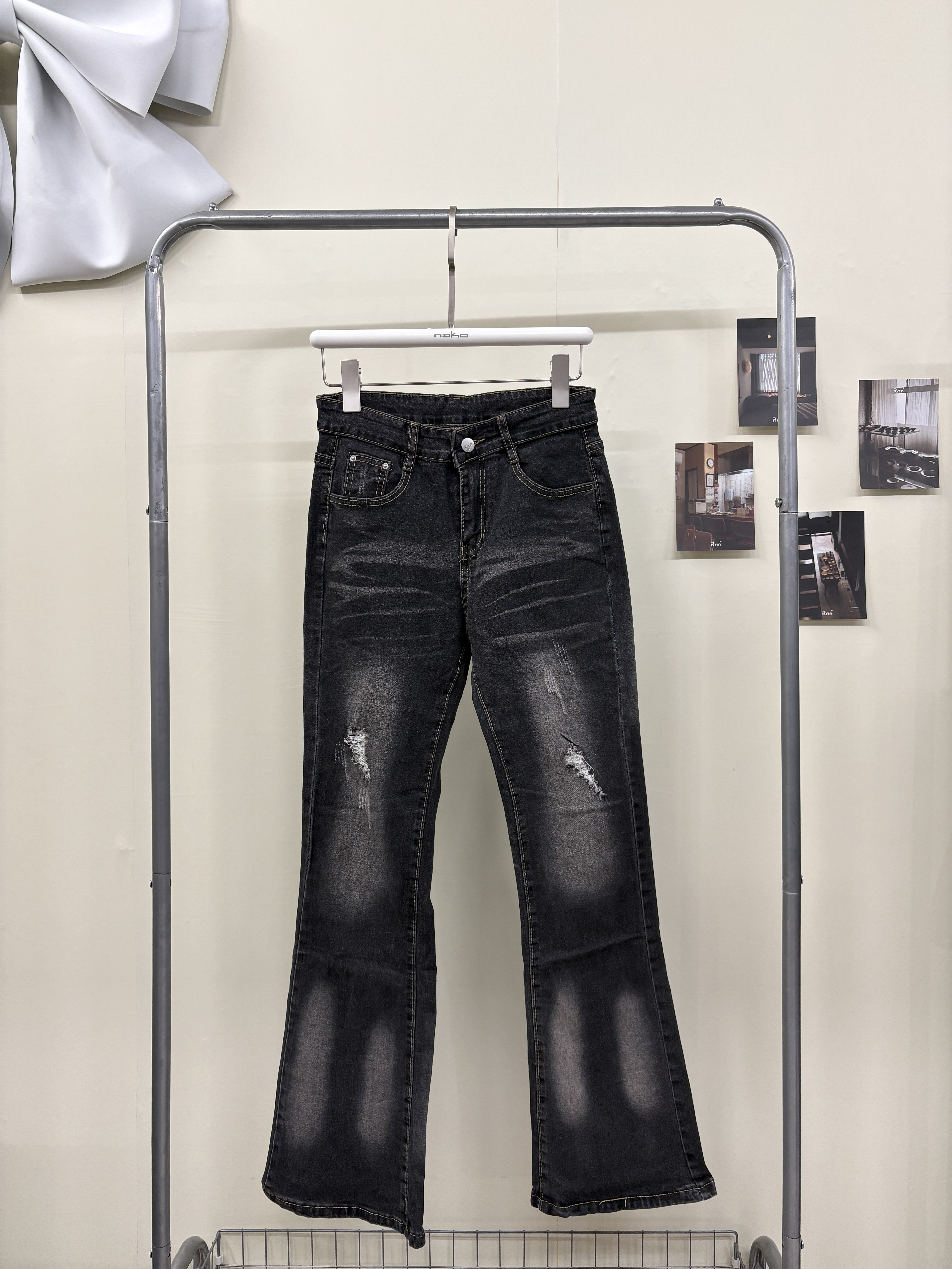 小刷破造型碳黑微喇叭牛仔褲