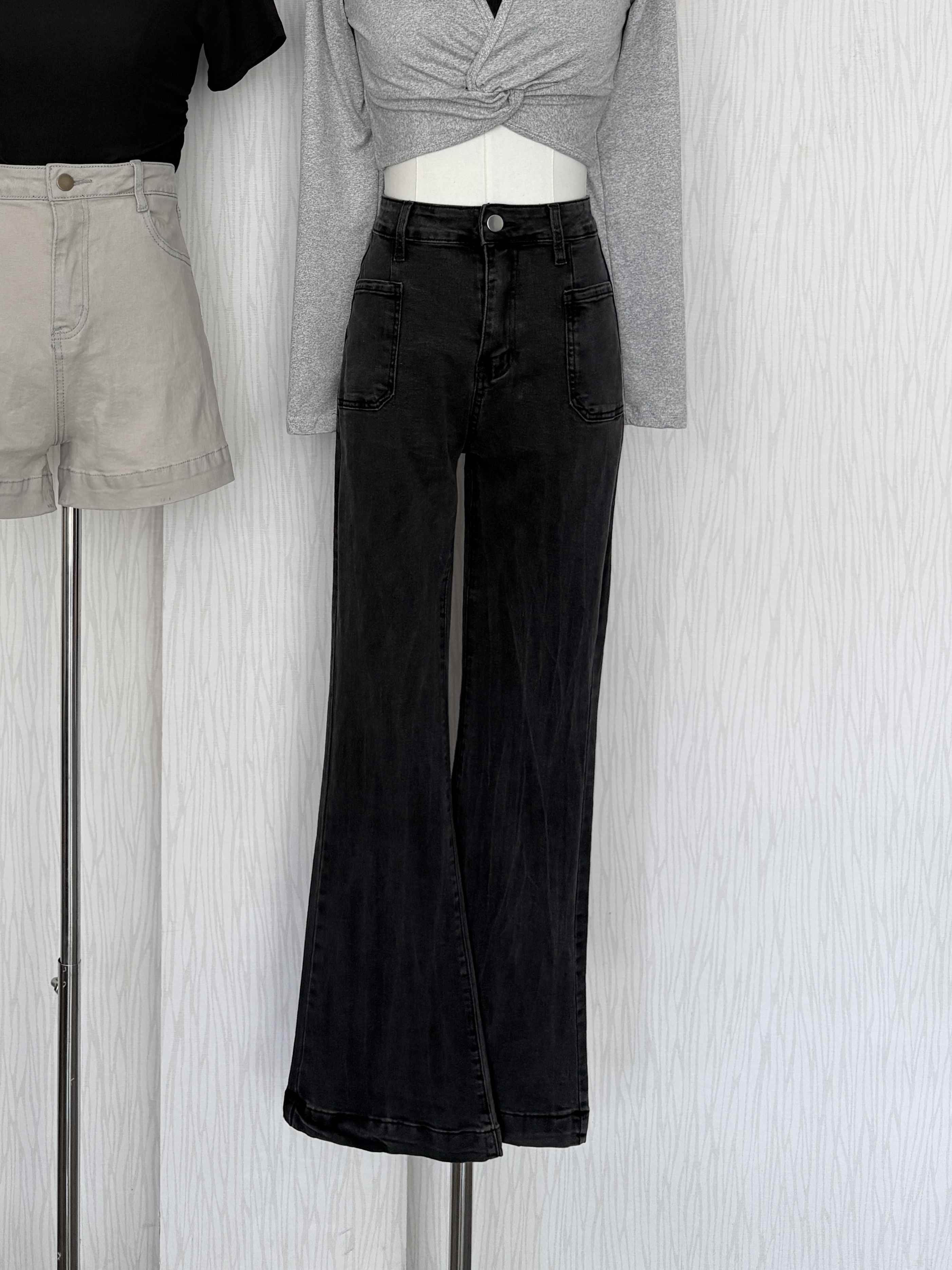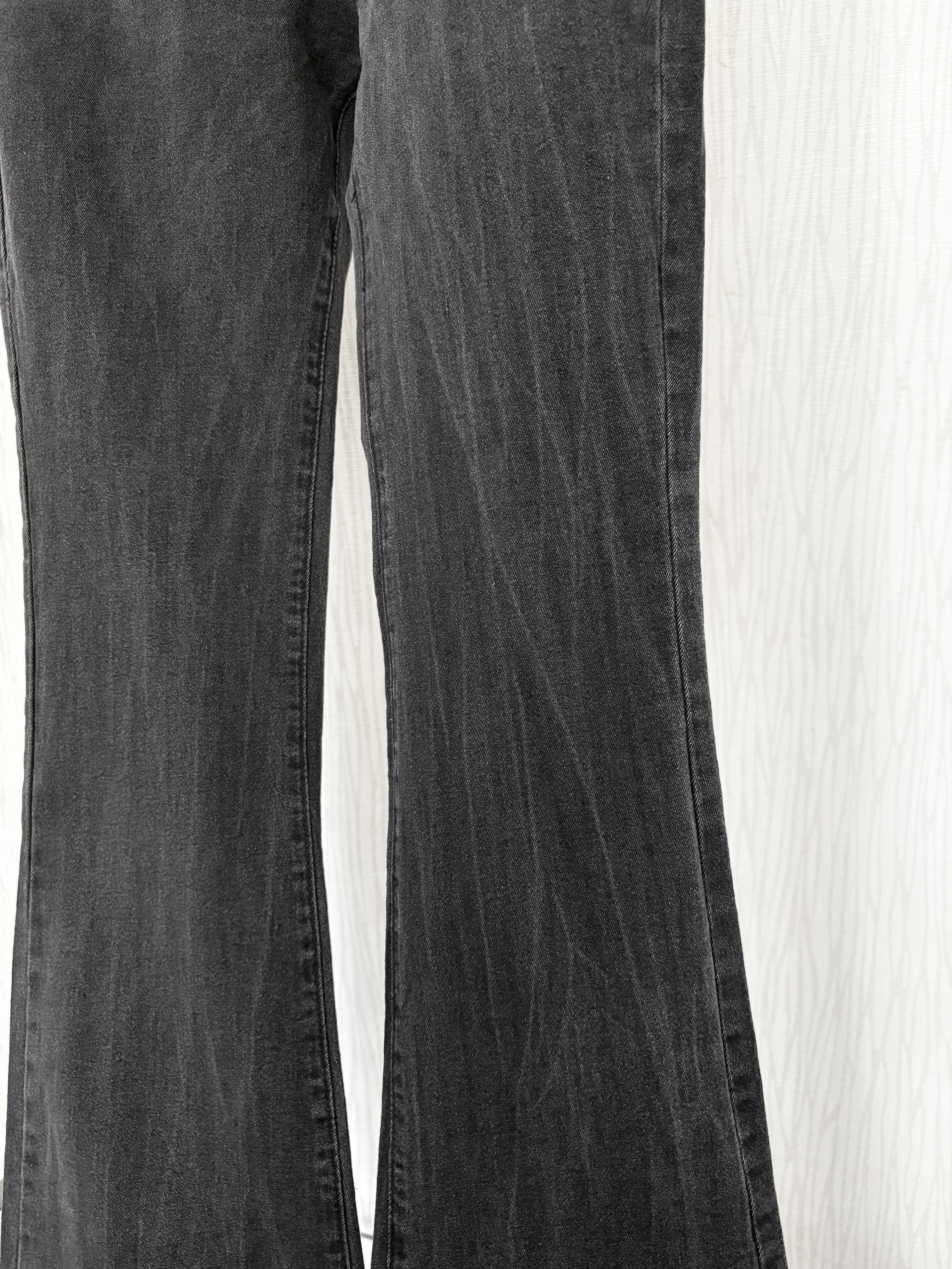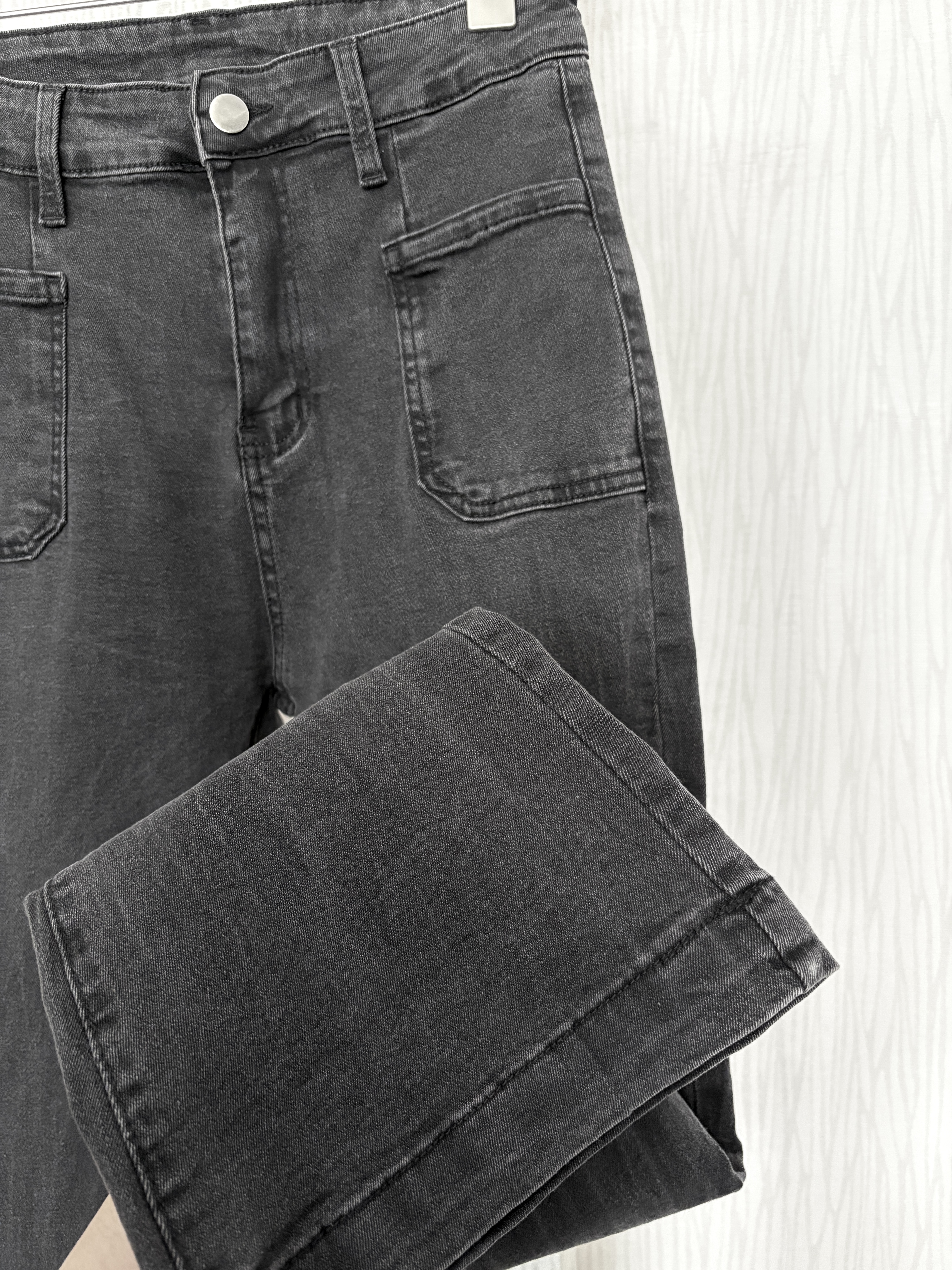 薄款豎刷痕碳灰色方口袋牛仔喇叭褲