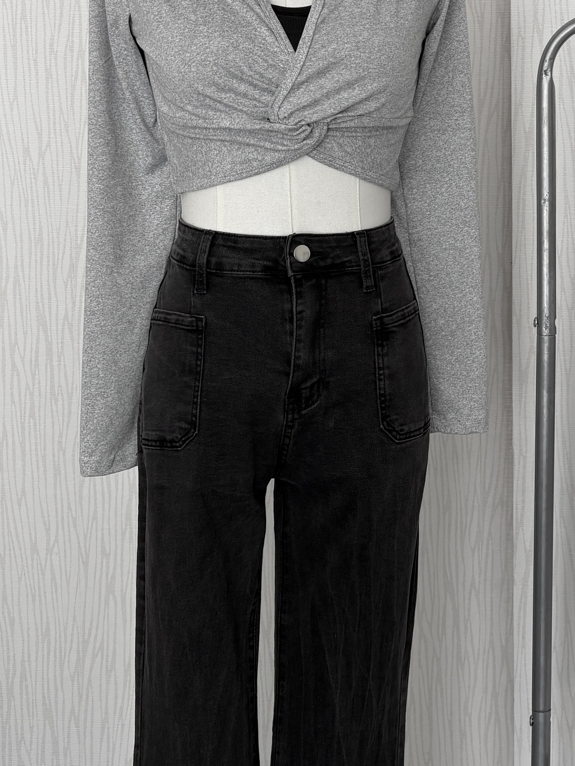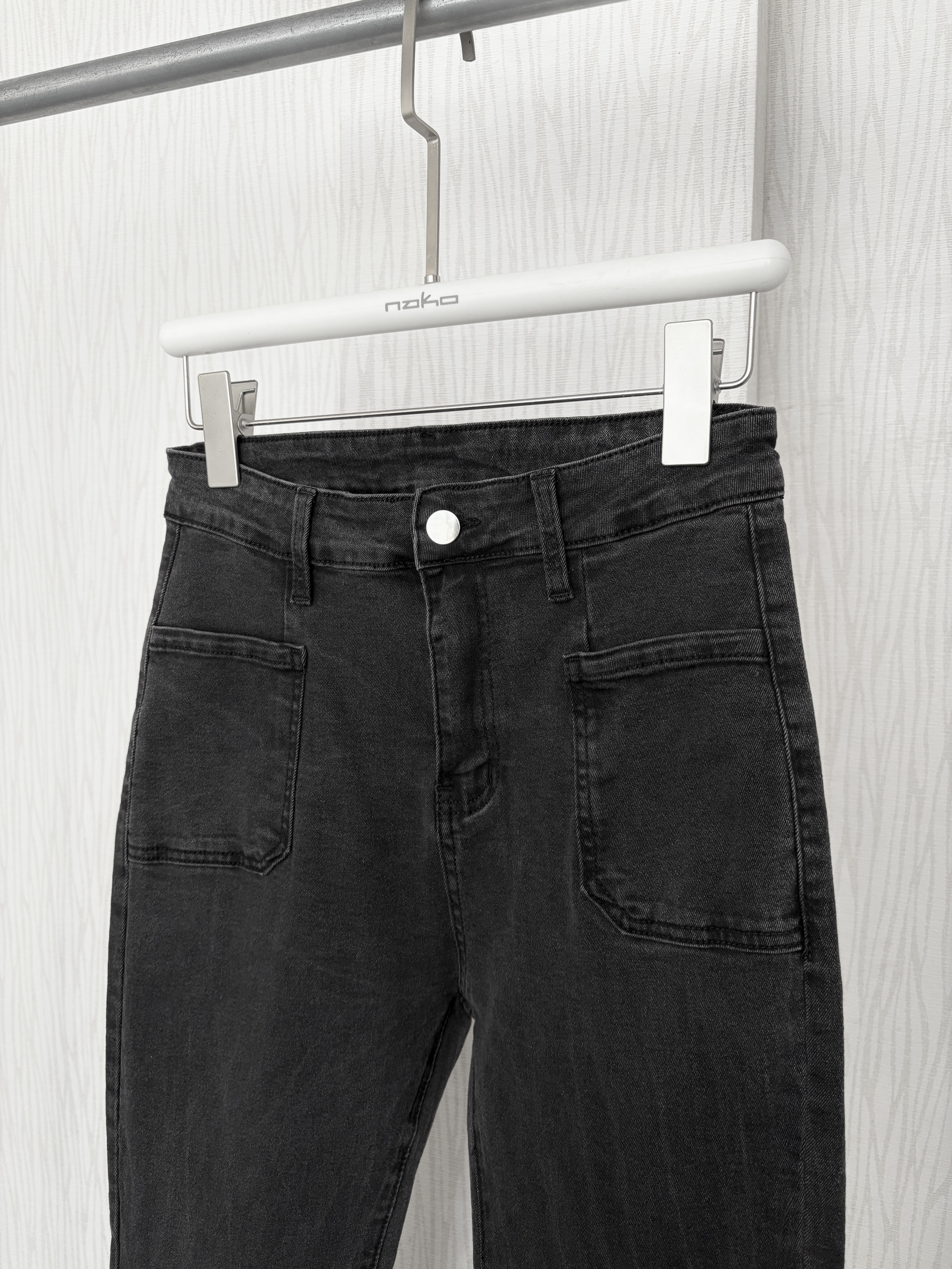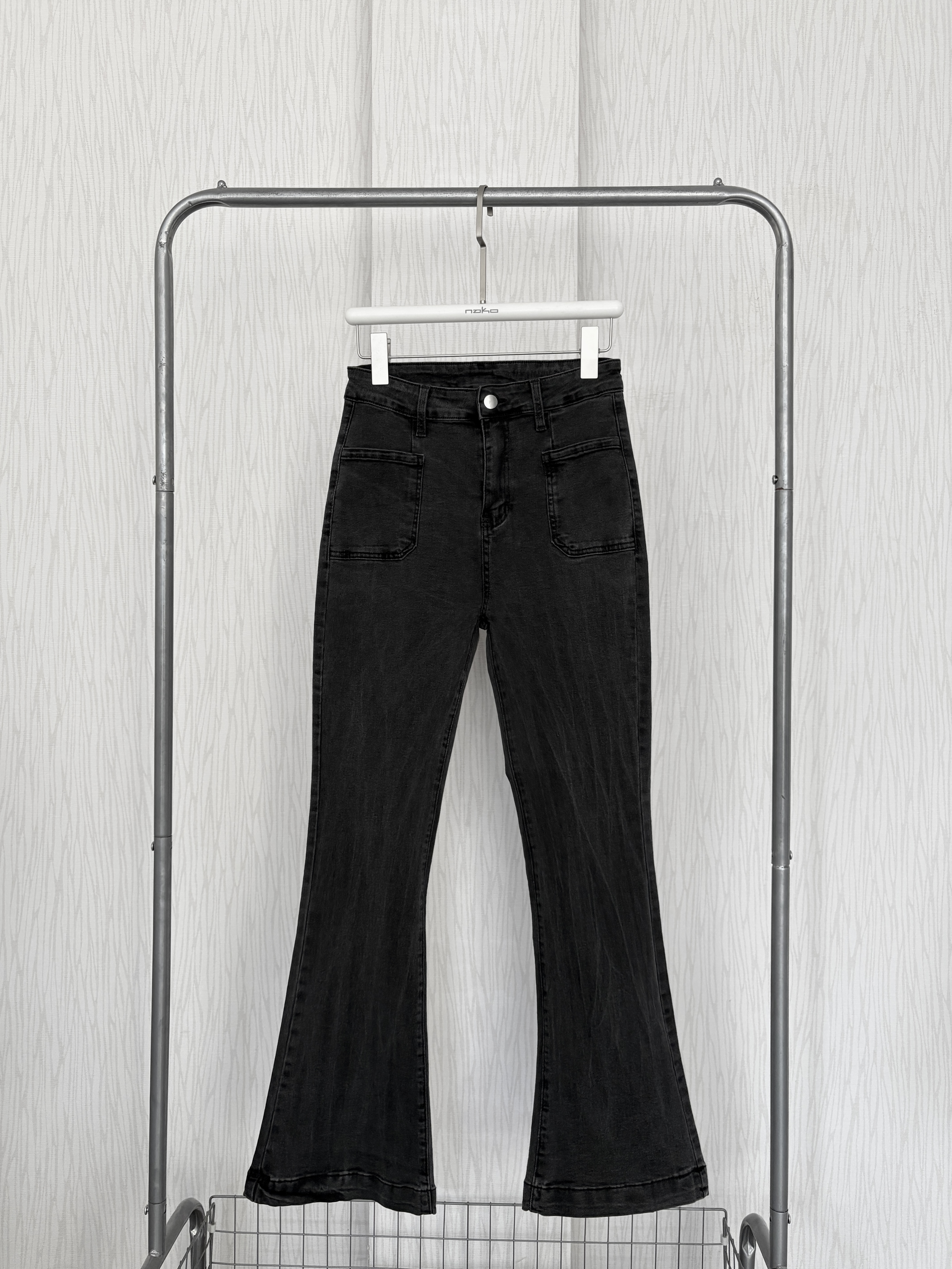 薄款豎刷痕碳灰色方口袋牛仔喇叭褲