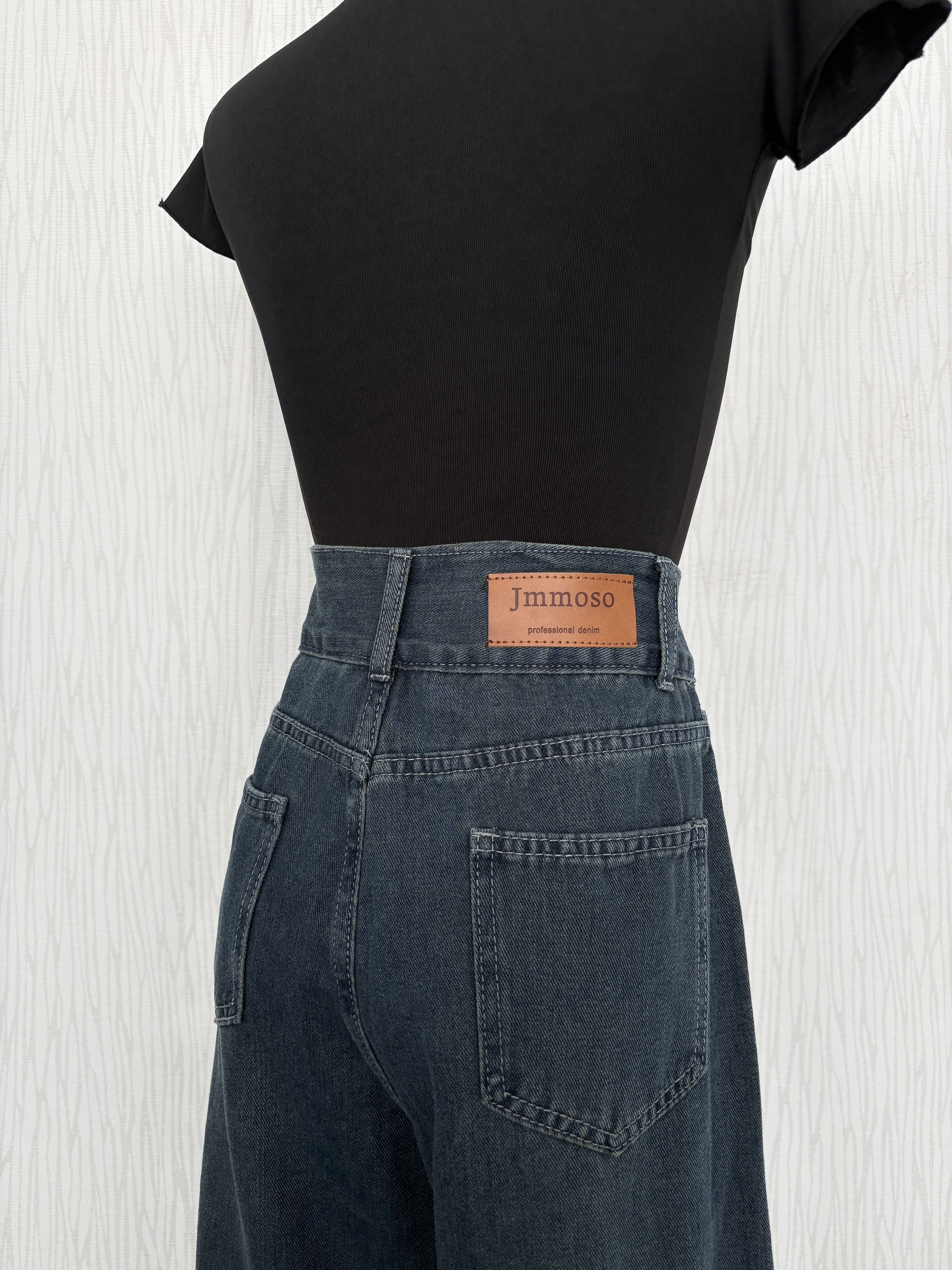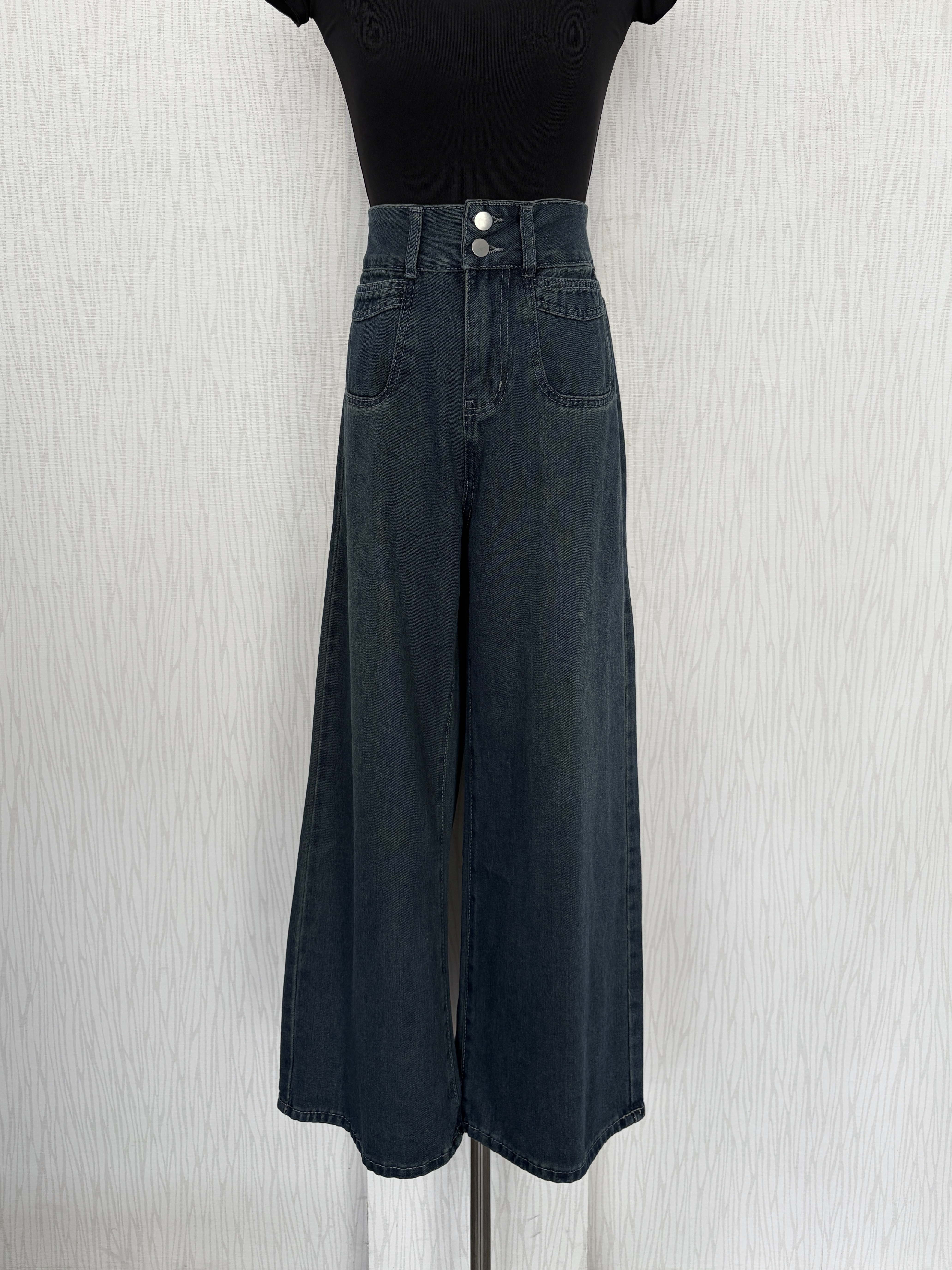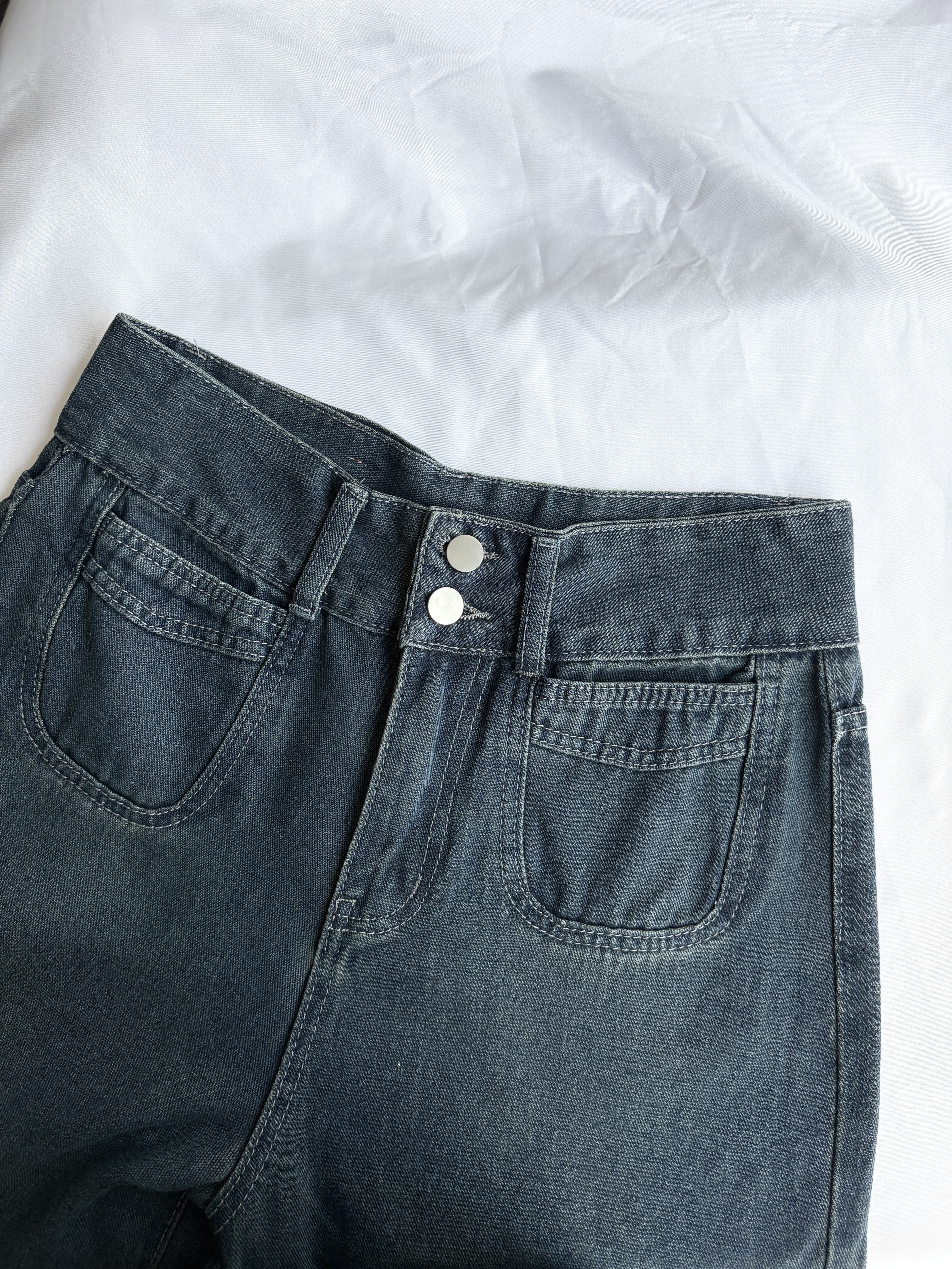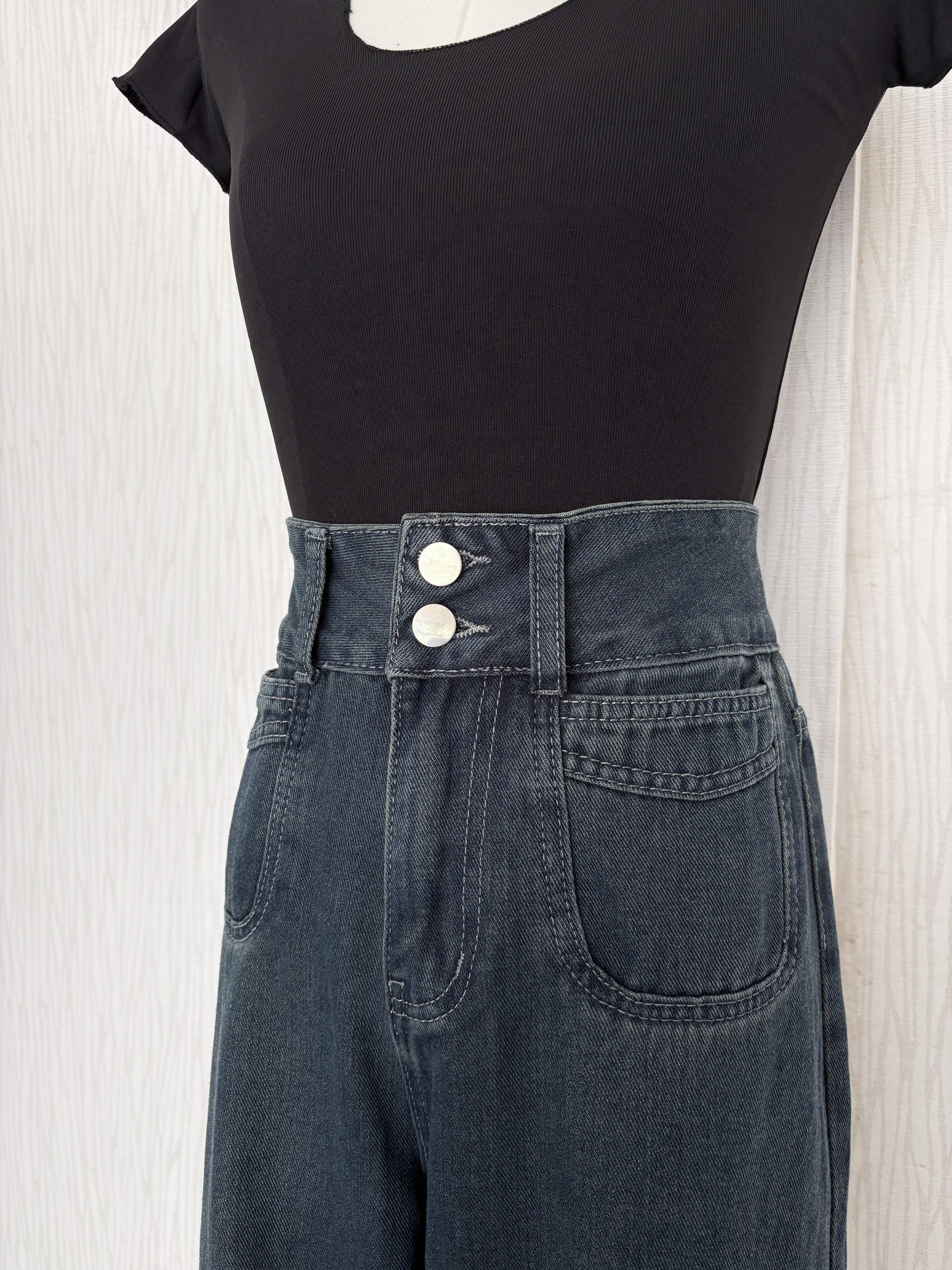 雙釦方口袋深藍色高腰直筒牛仔寬褲