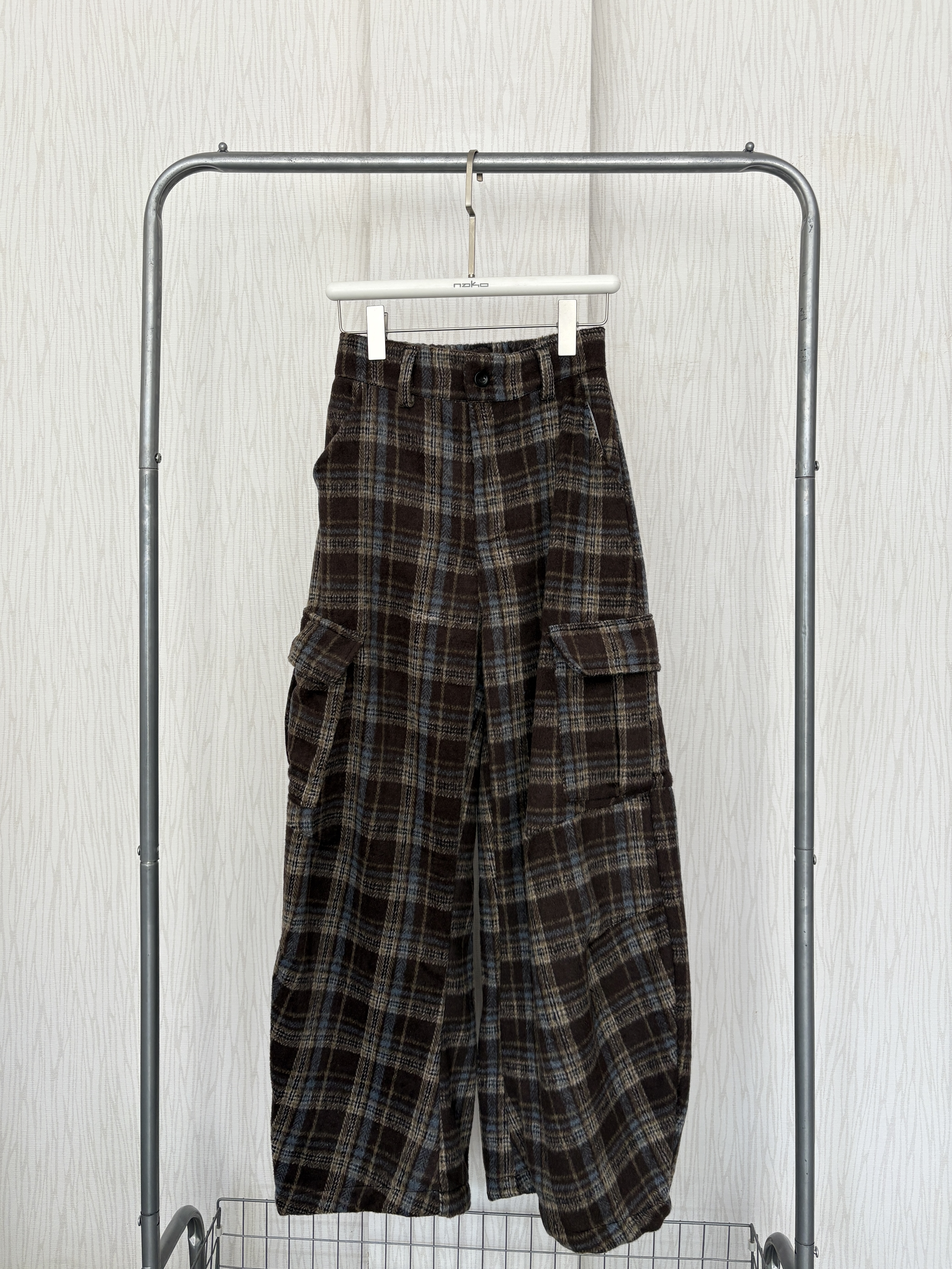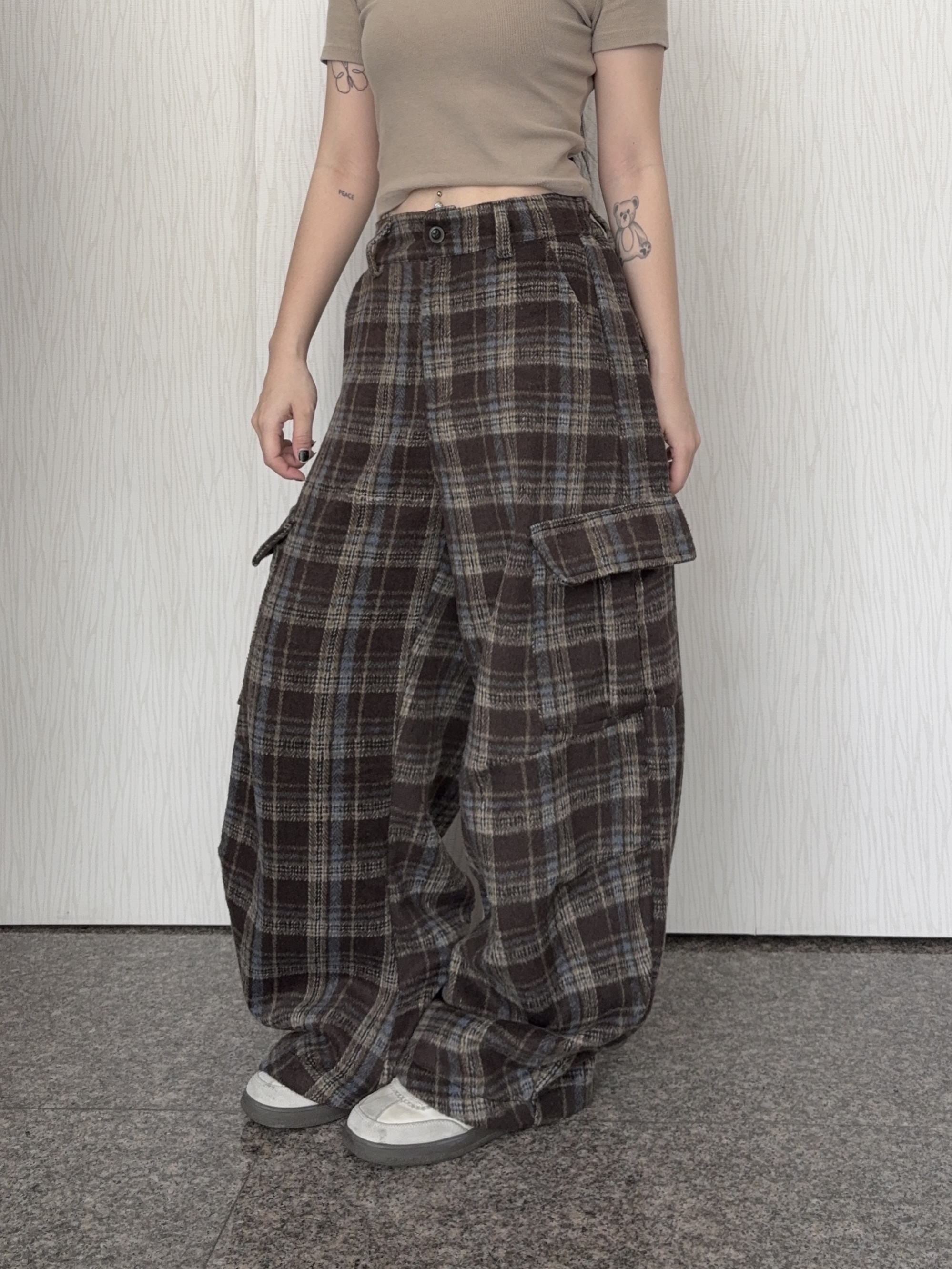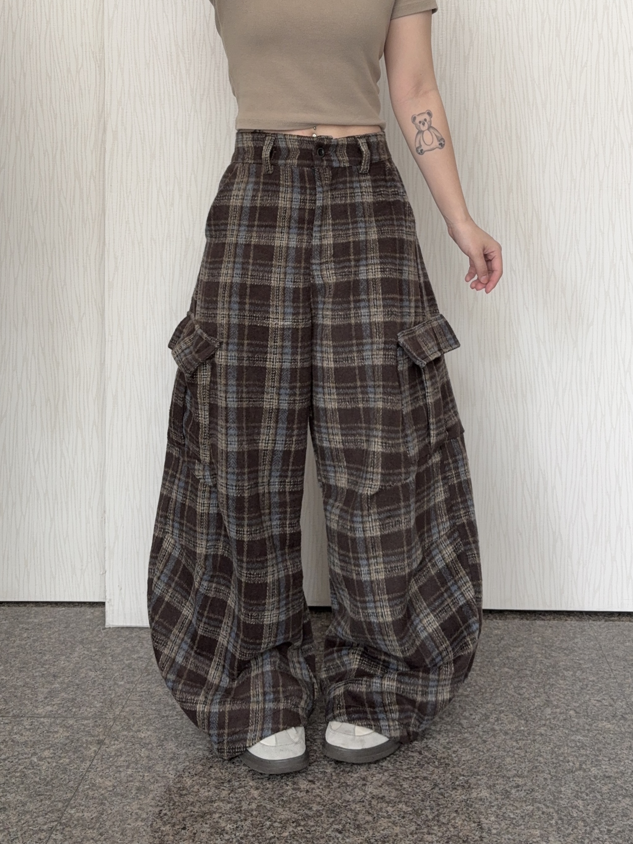 秋冬款-三色格紋軟薄針織口袋工裝棉褲