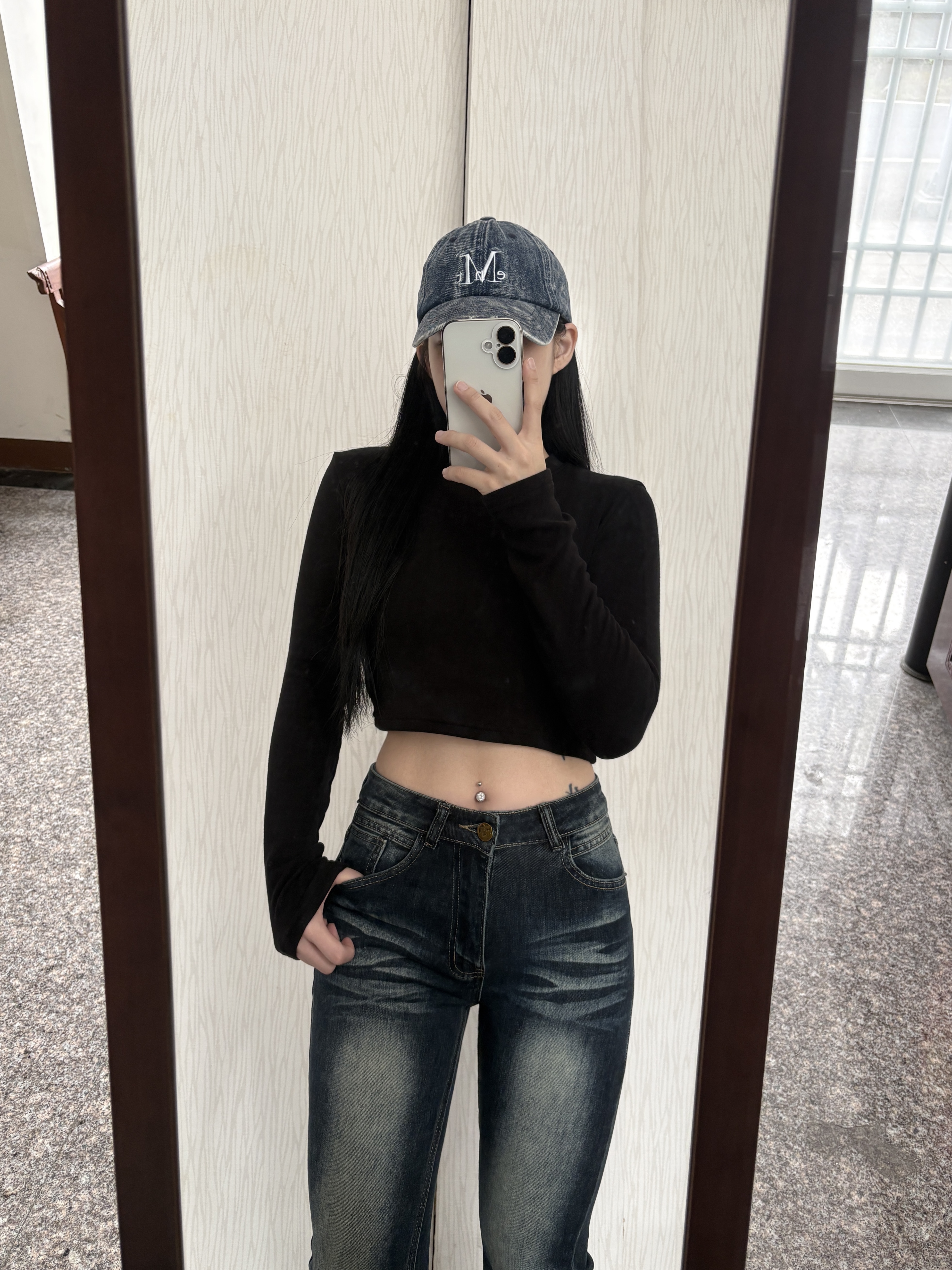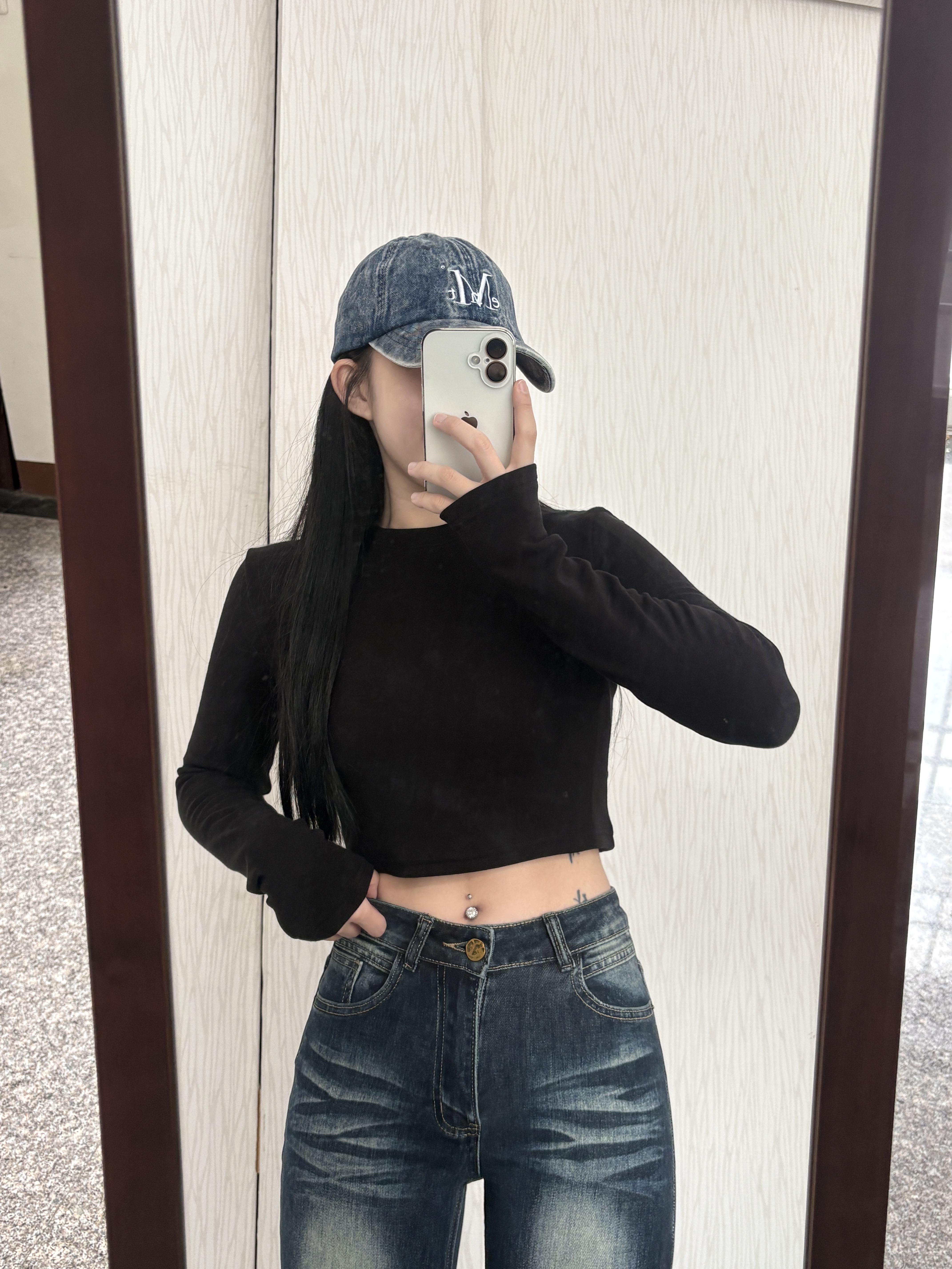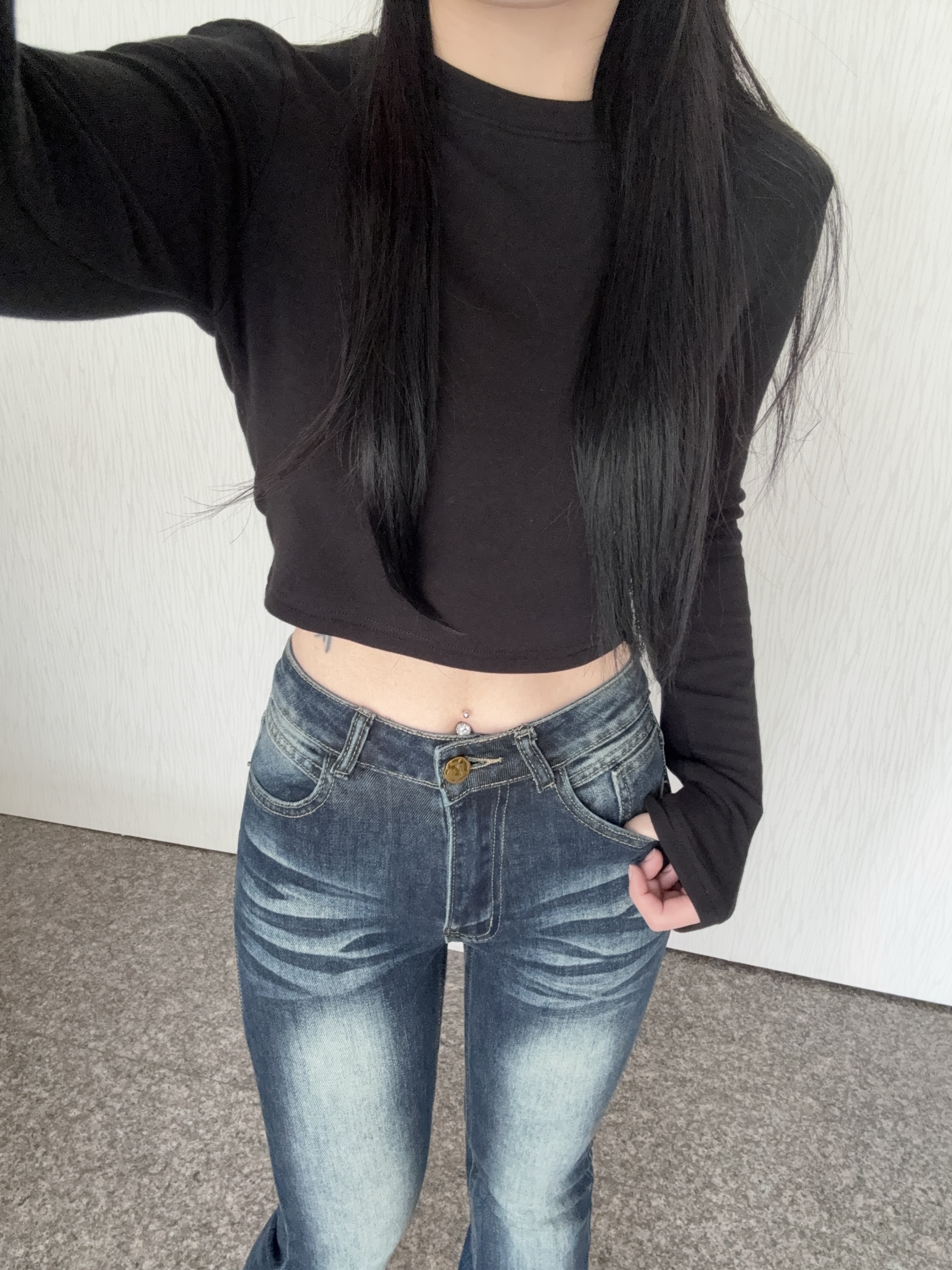 U領直坑紋超彈短版長袖上衣