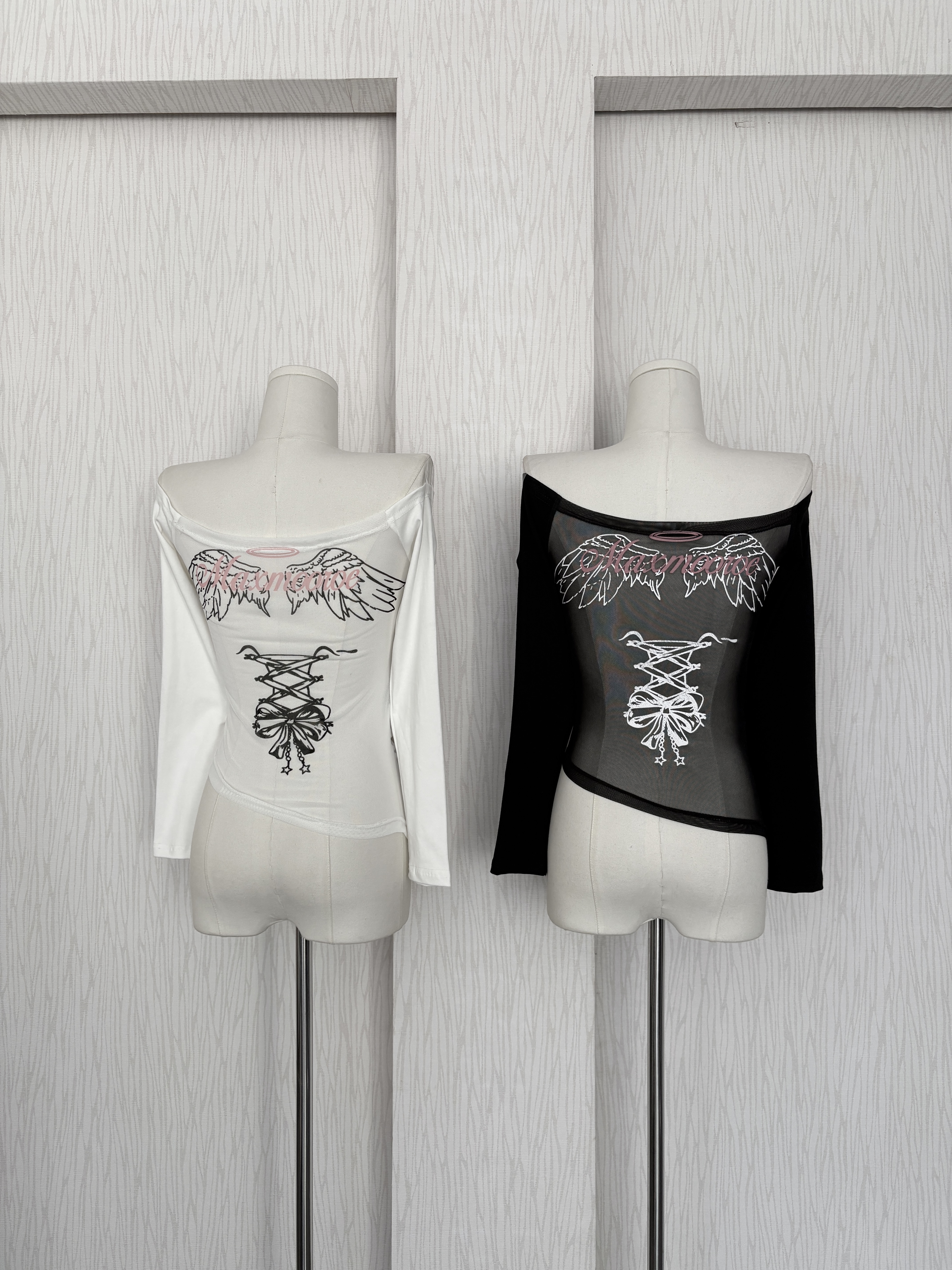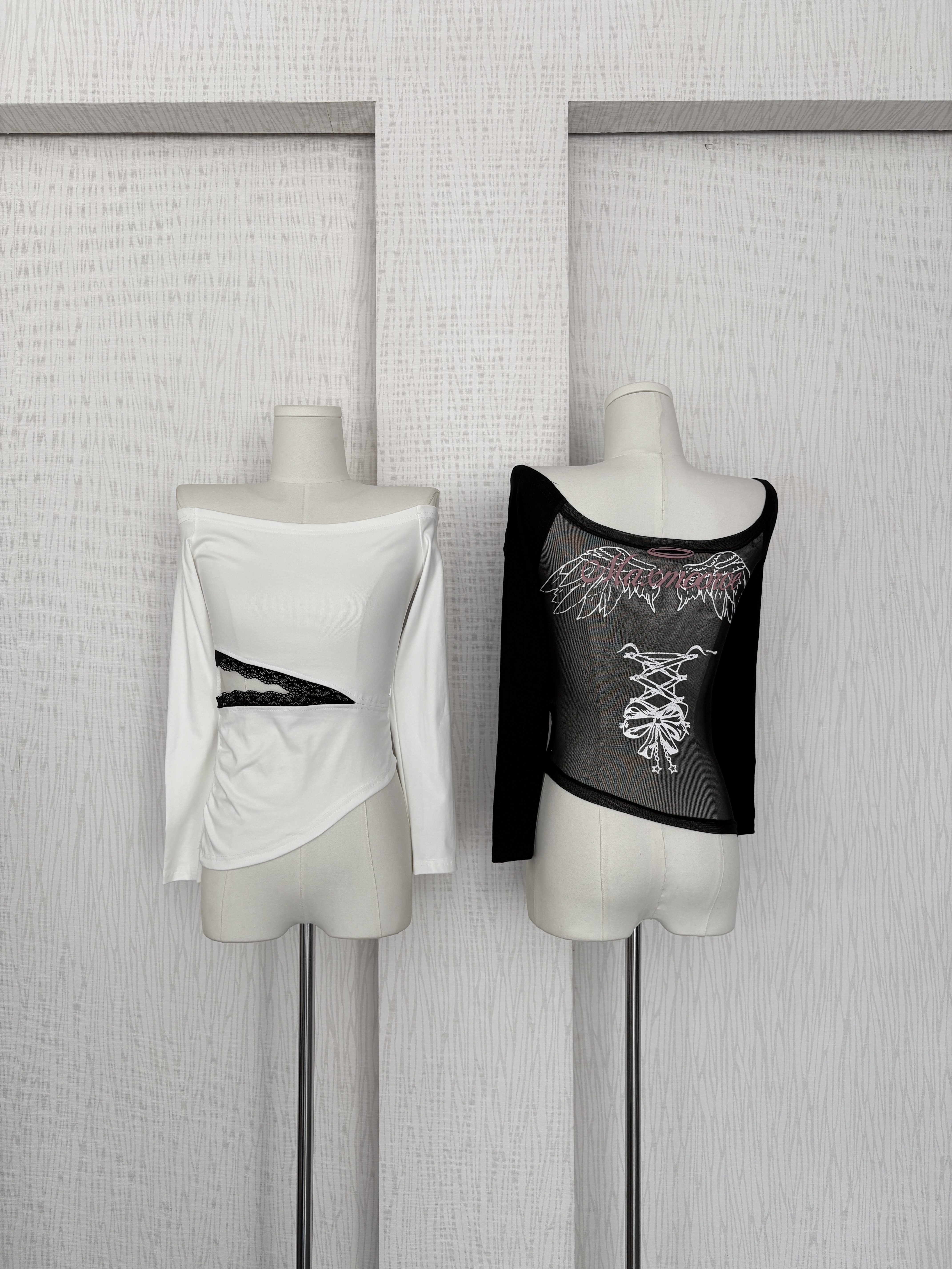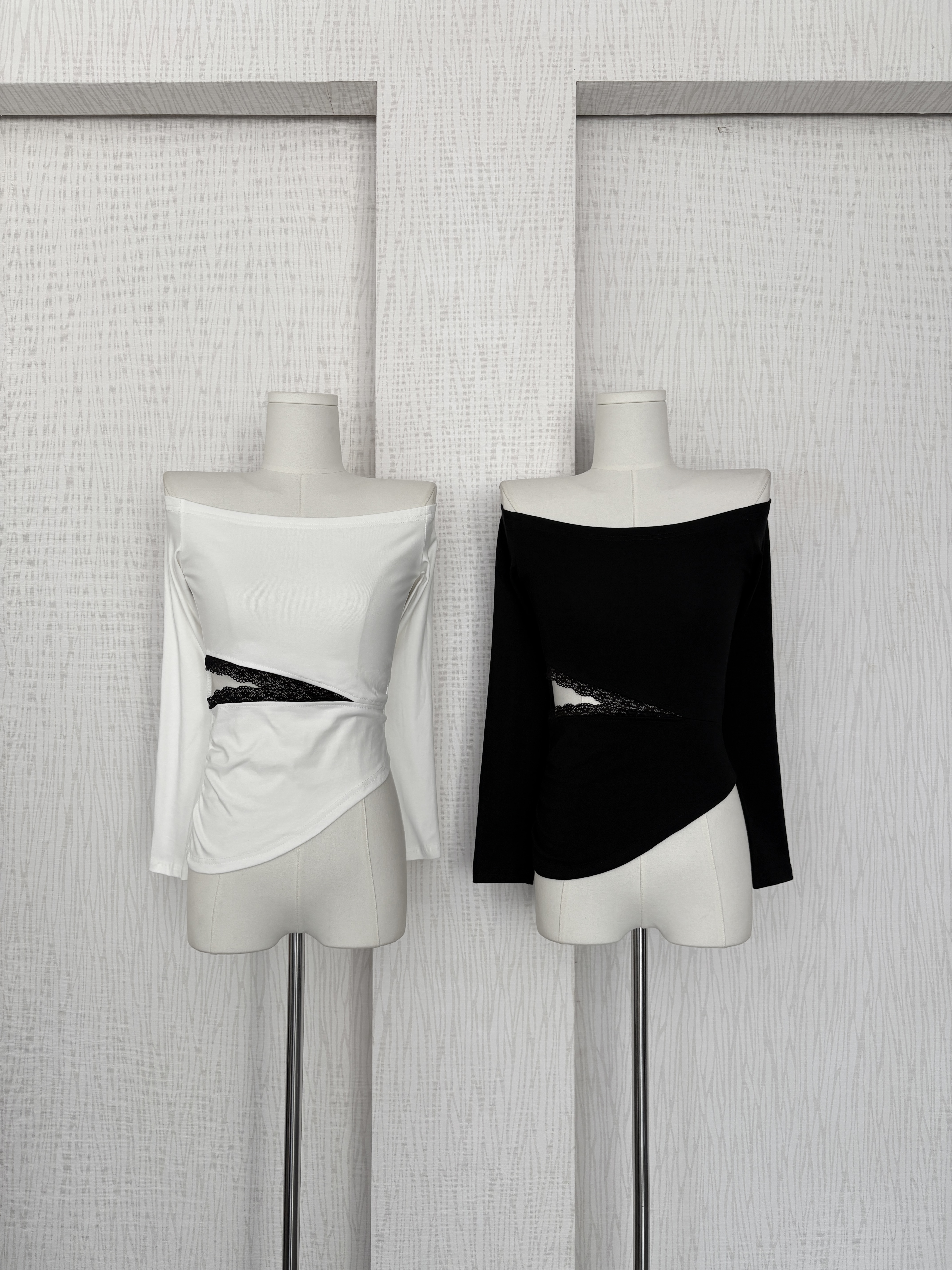 蕾絲腰開衩網紗一字領兩面穿棉質上衣