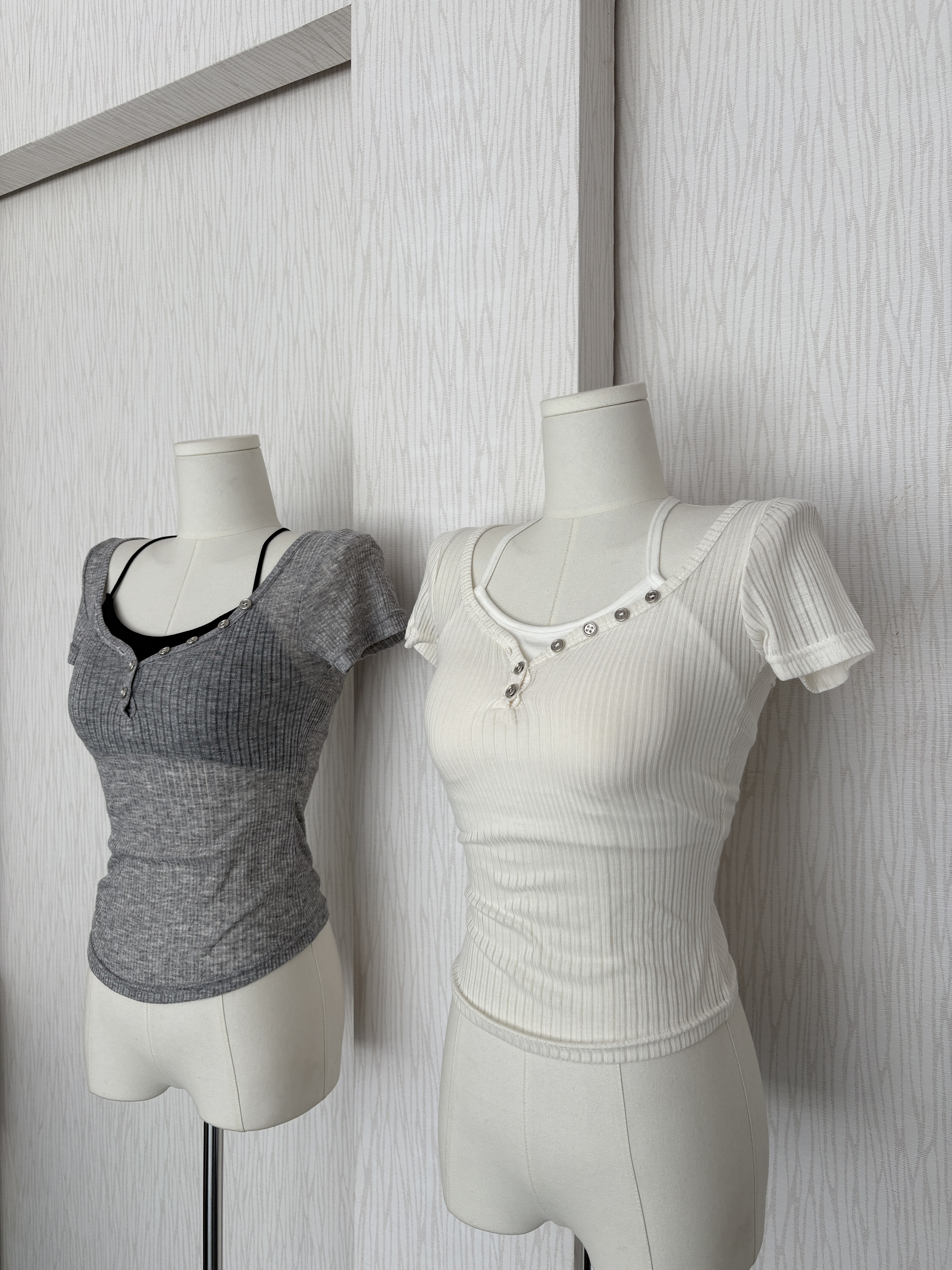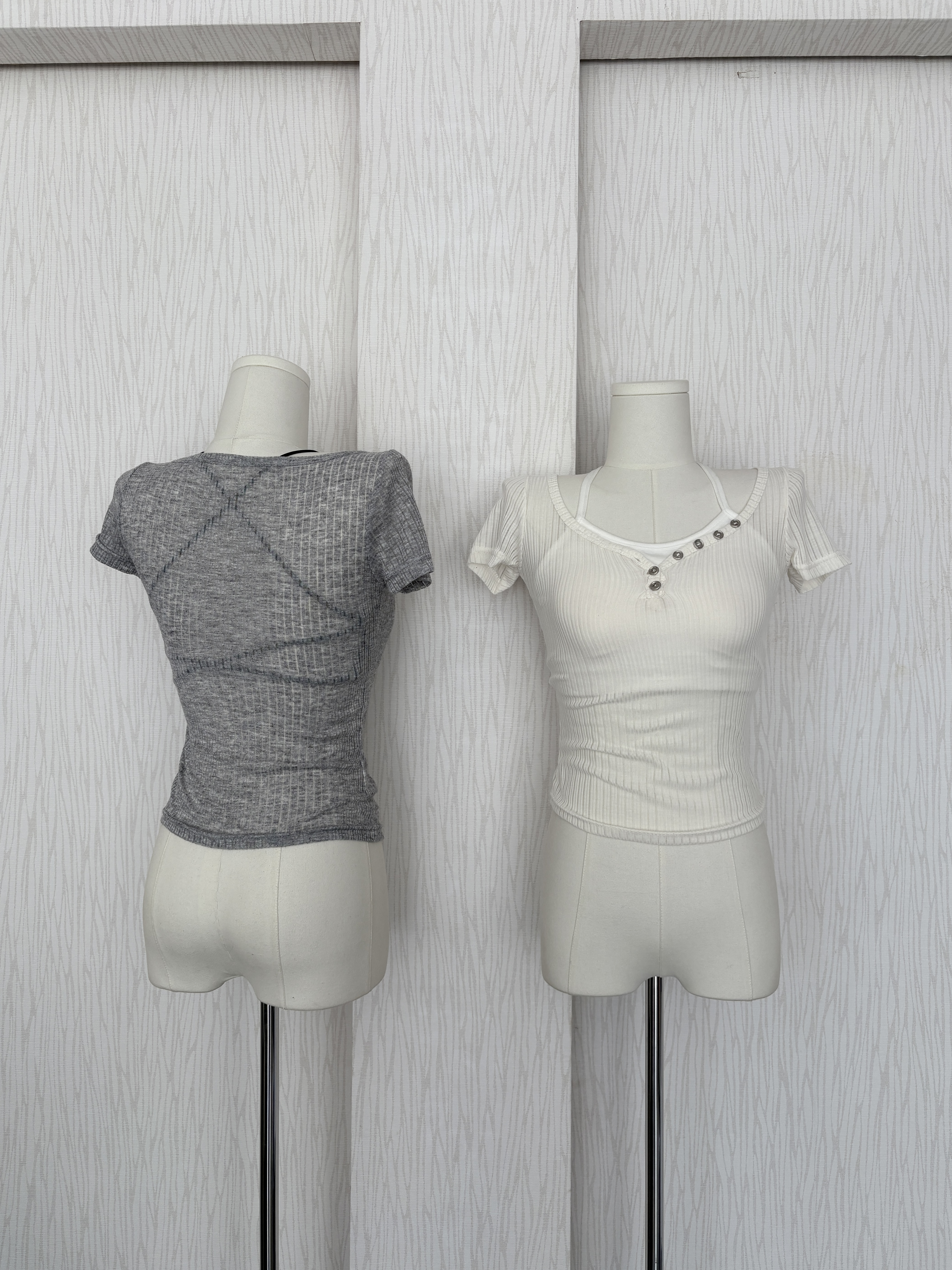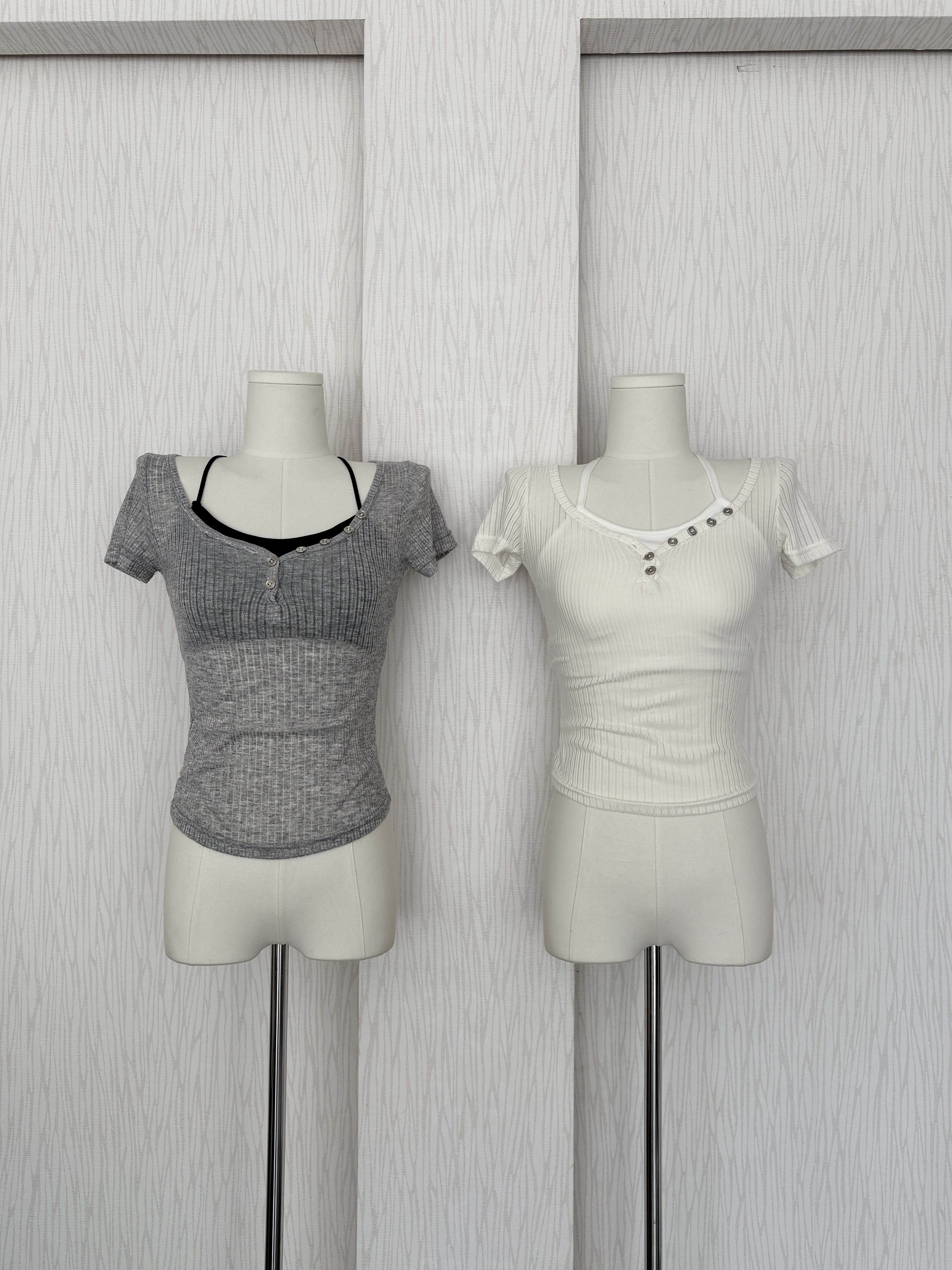 銀釦簍空直紋感透膚短袖軟薄貼身上衣