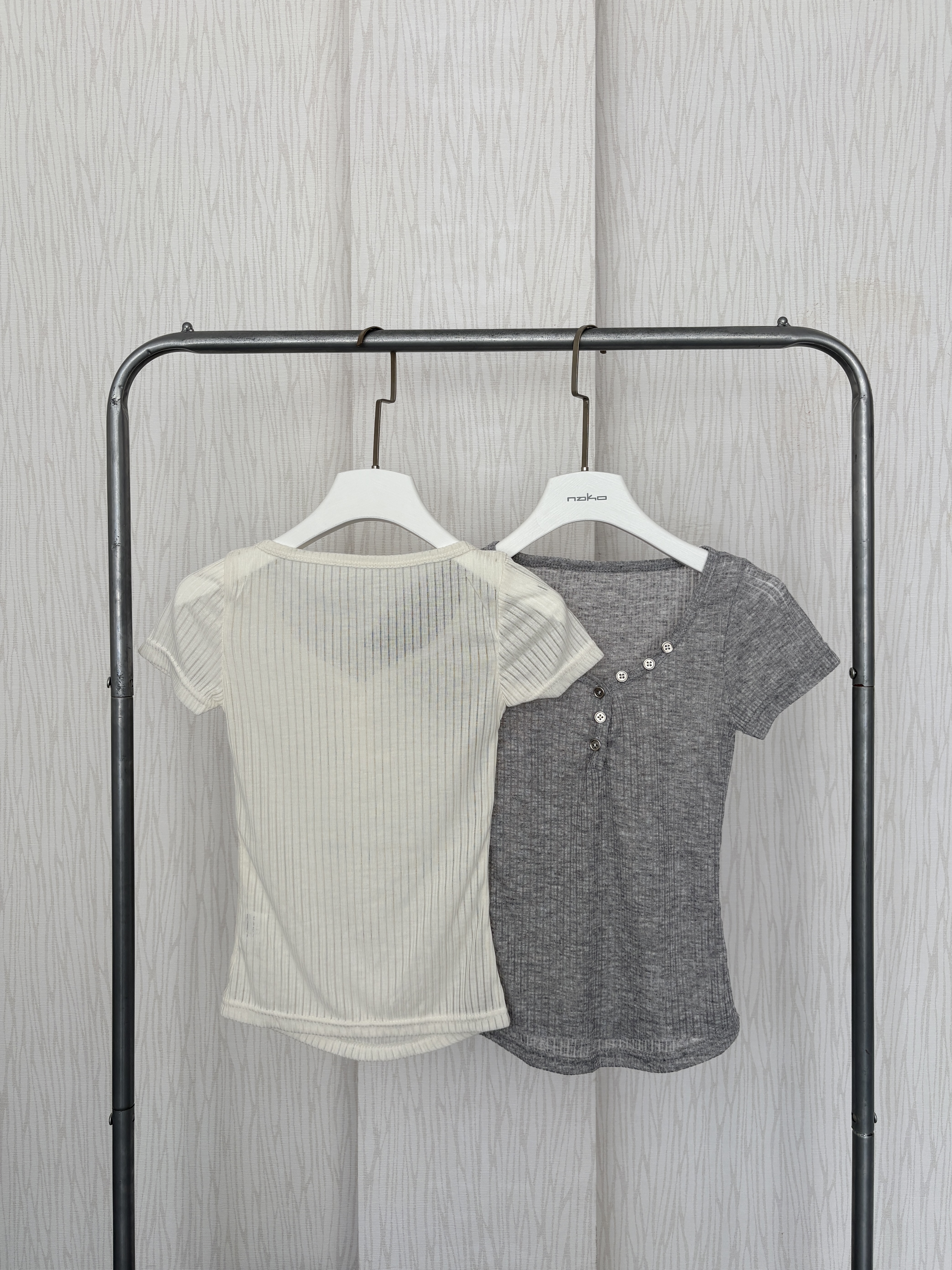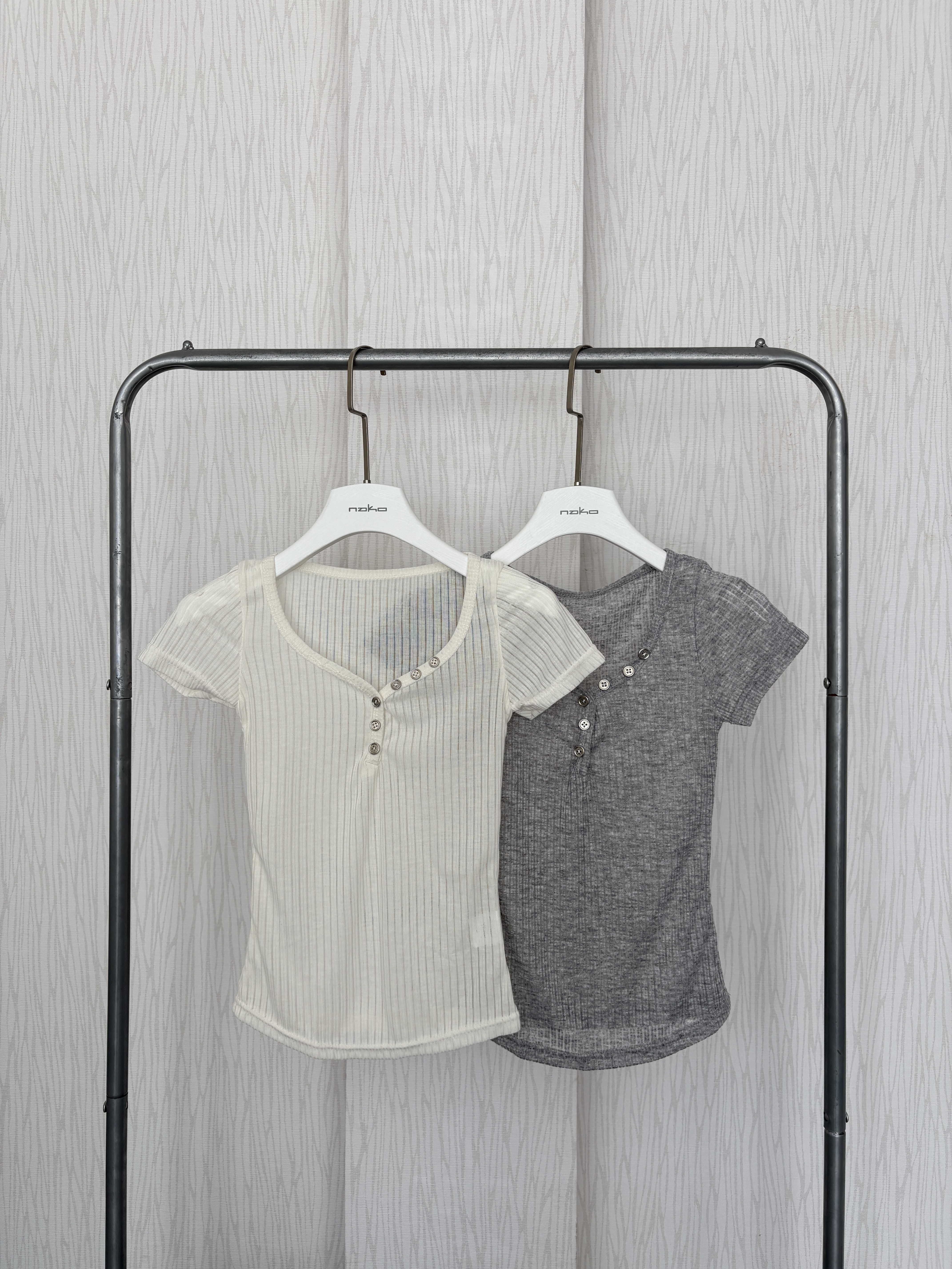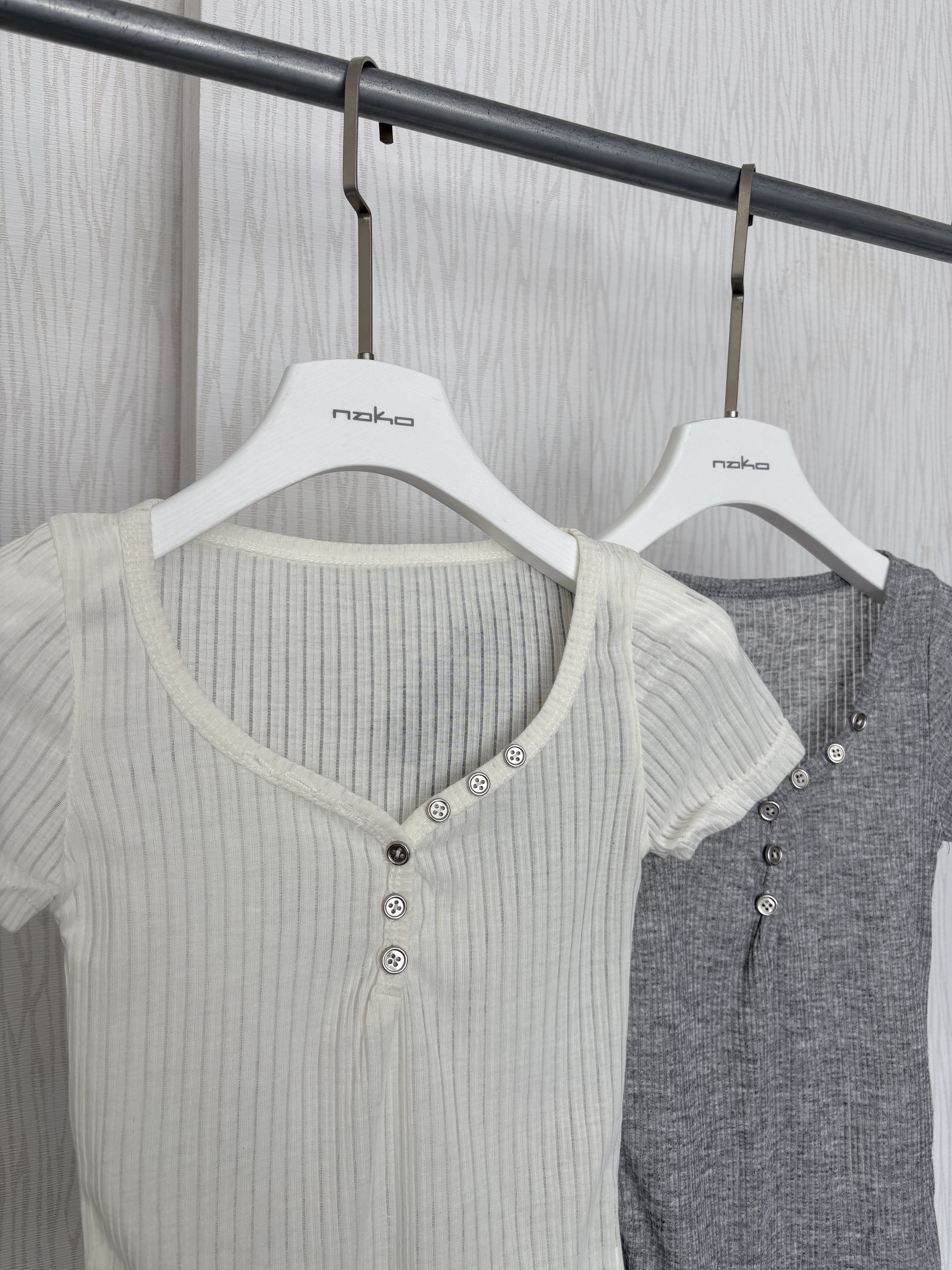 銀釦簍空直紋感透膚短袖軟薄貼身上衣