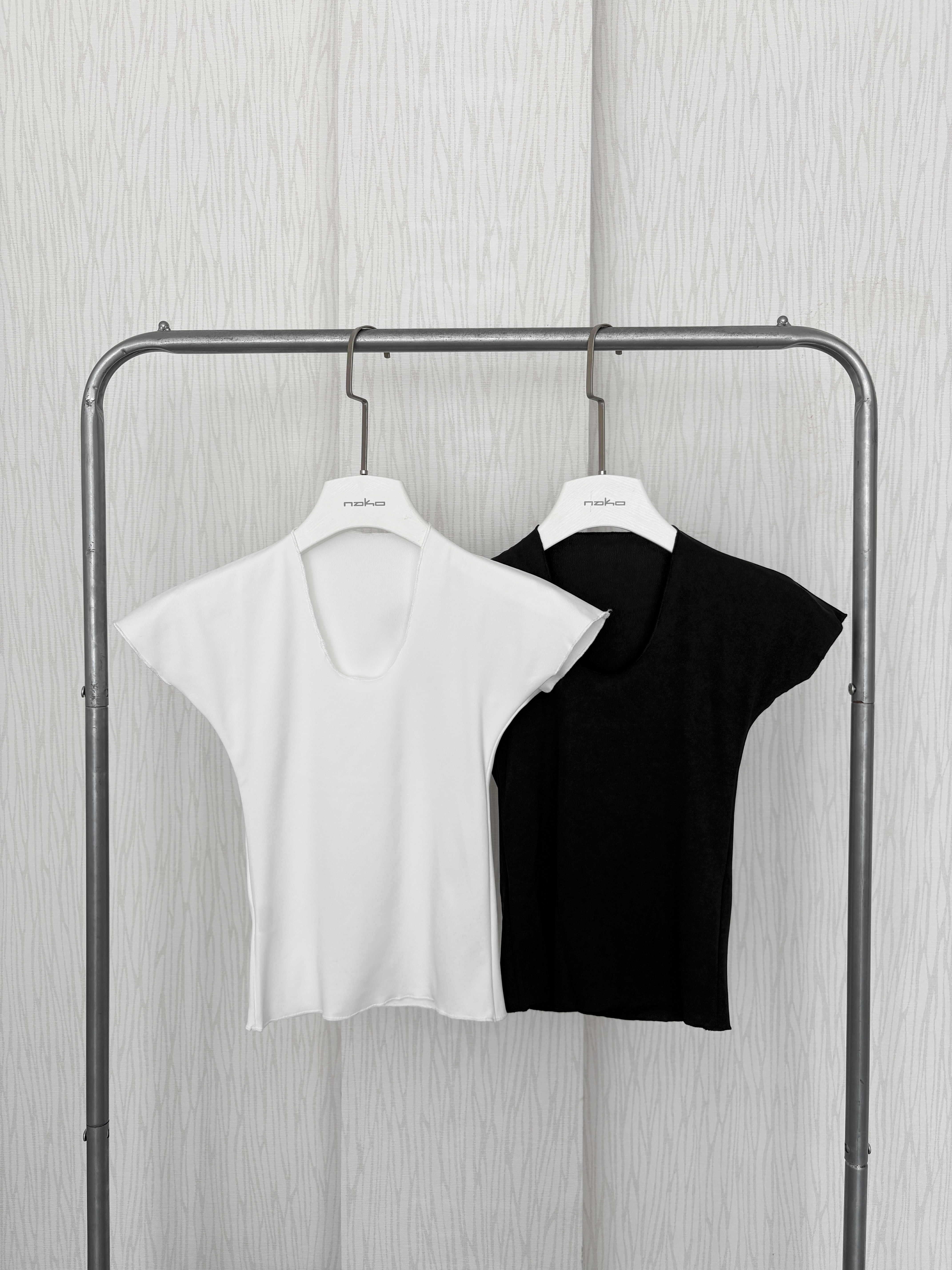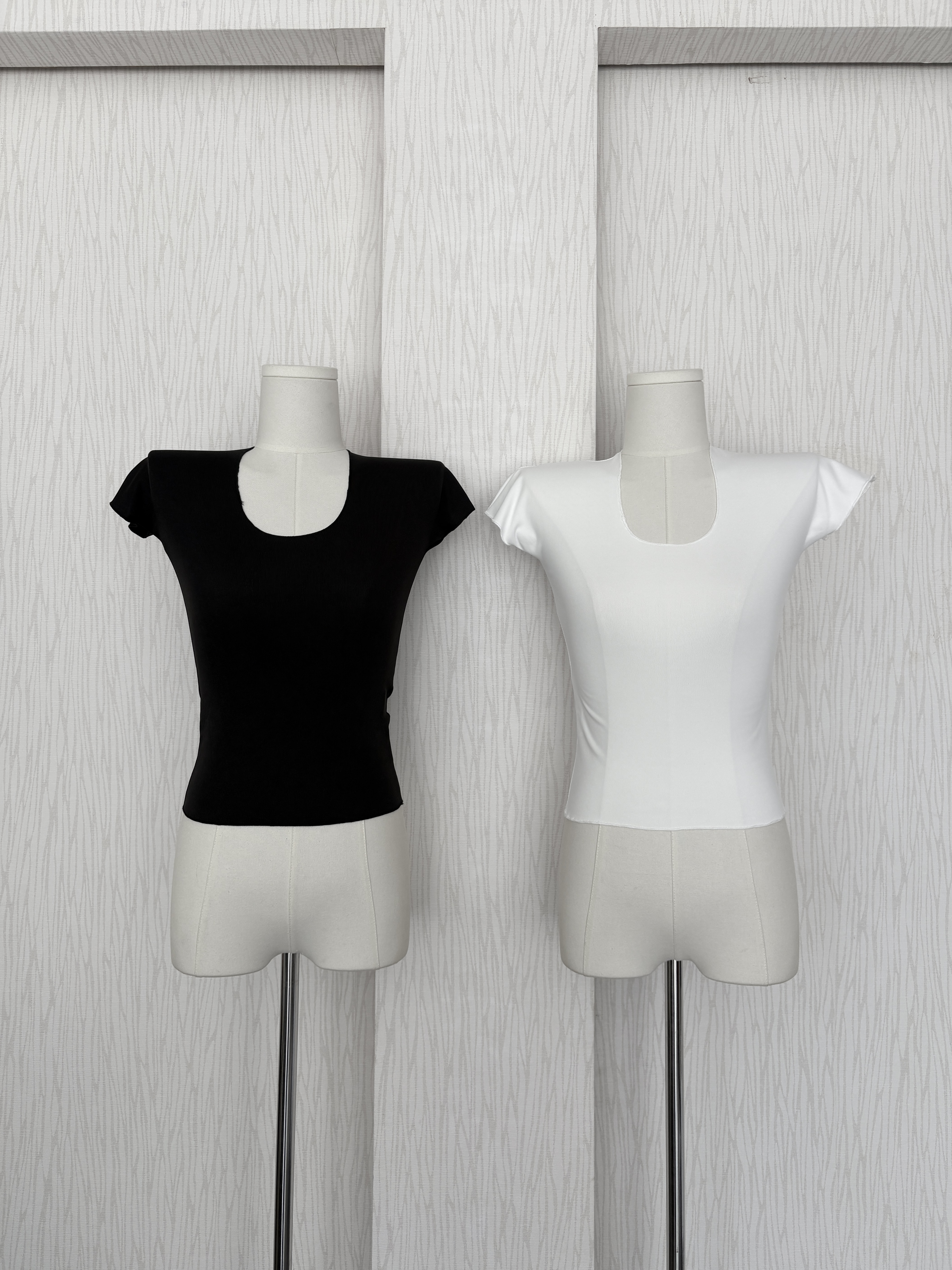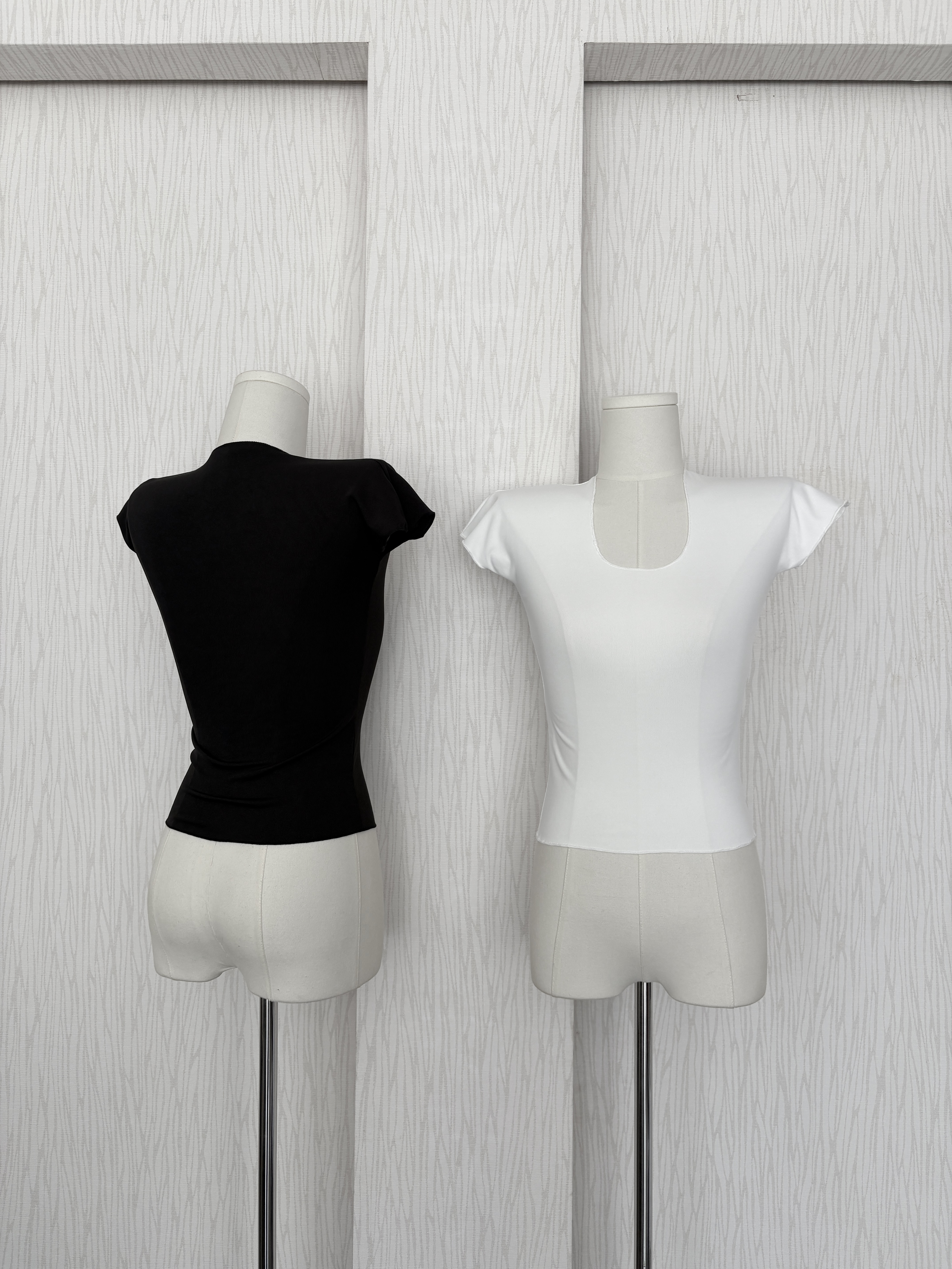 銀釦簍空直紋感透膚短袖軟薄貼身上衣