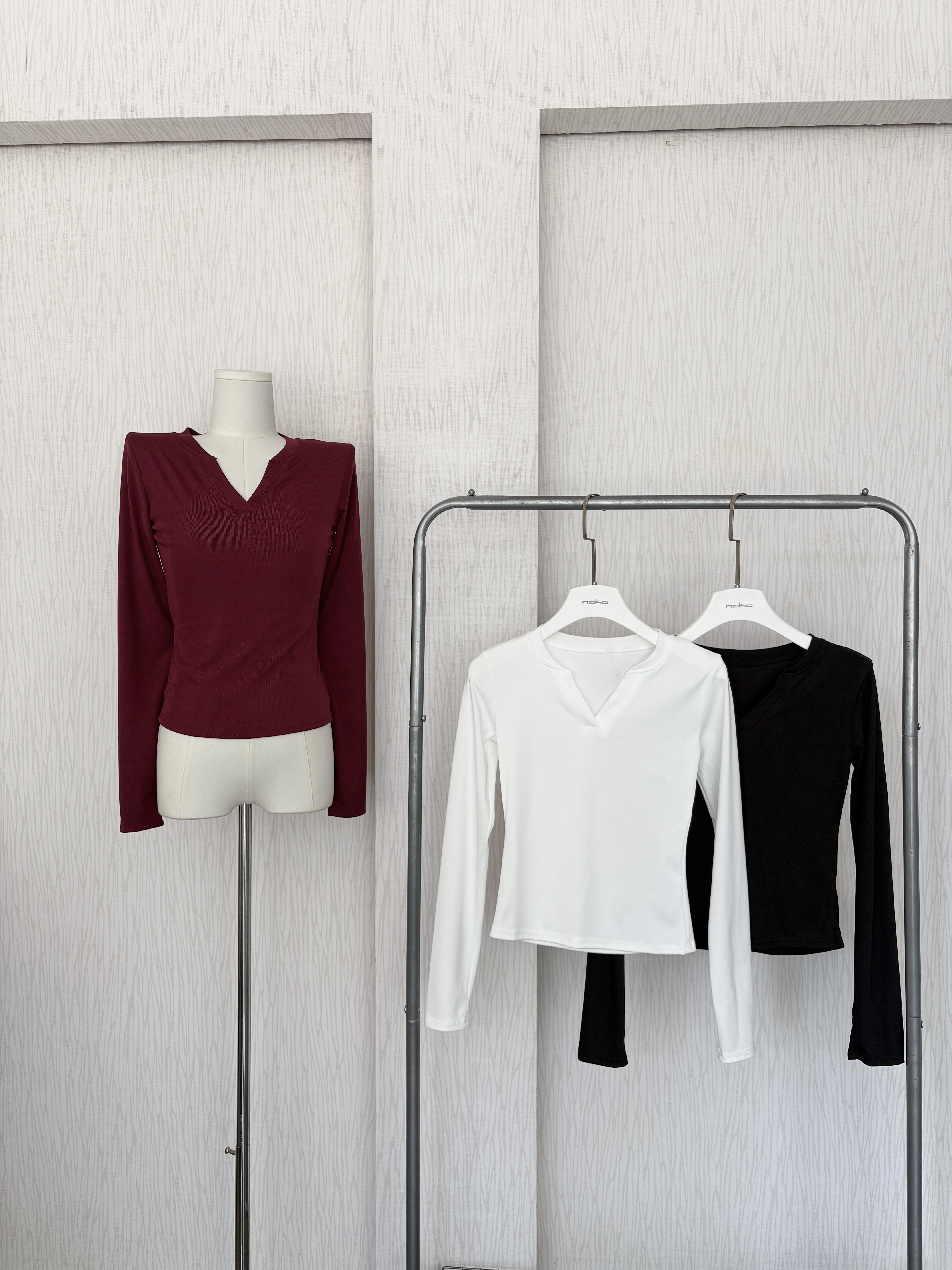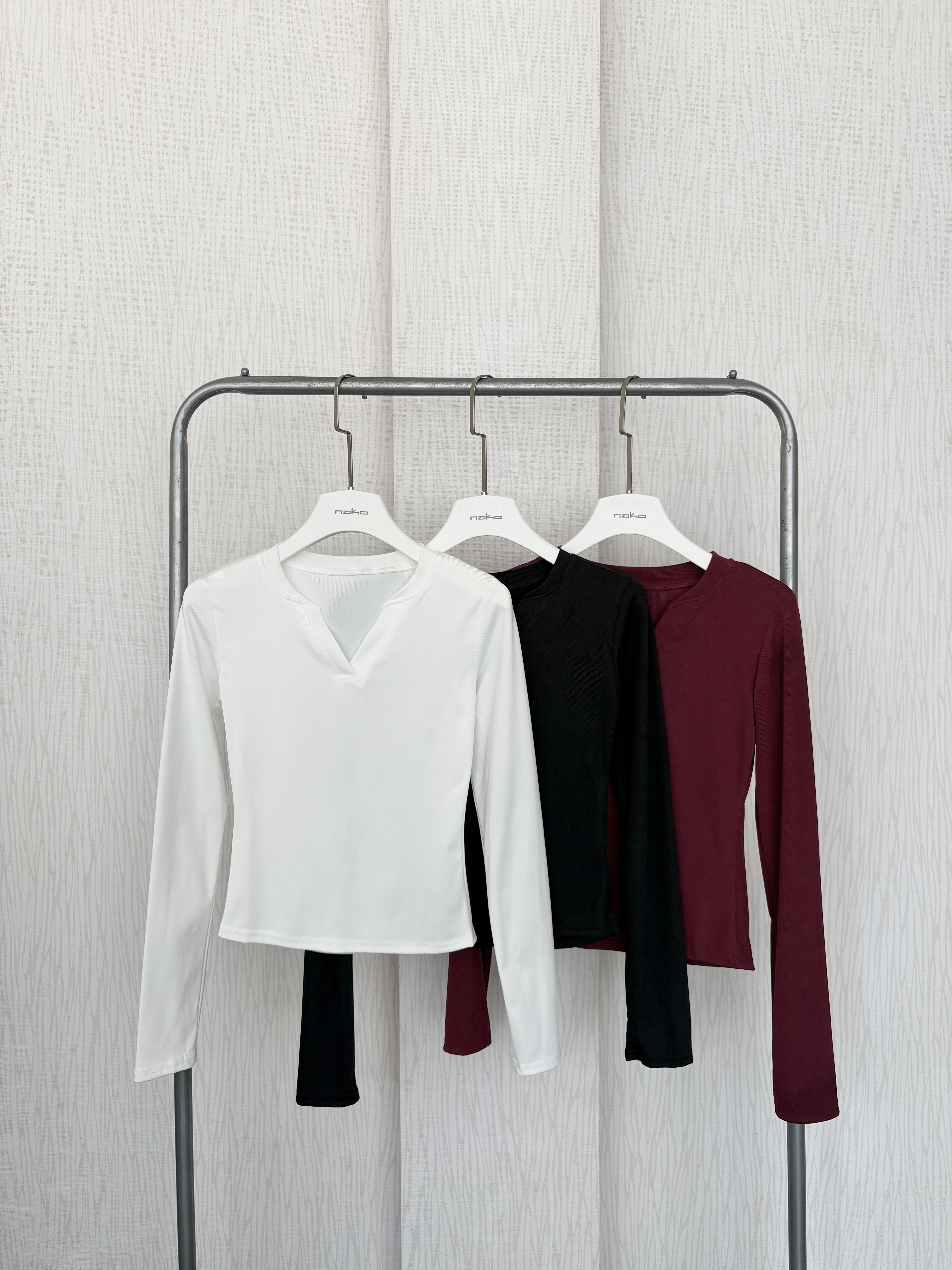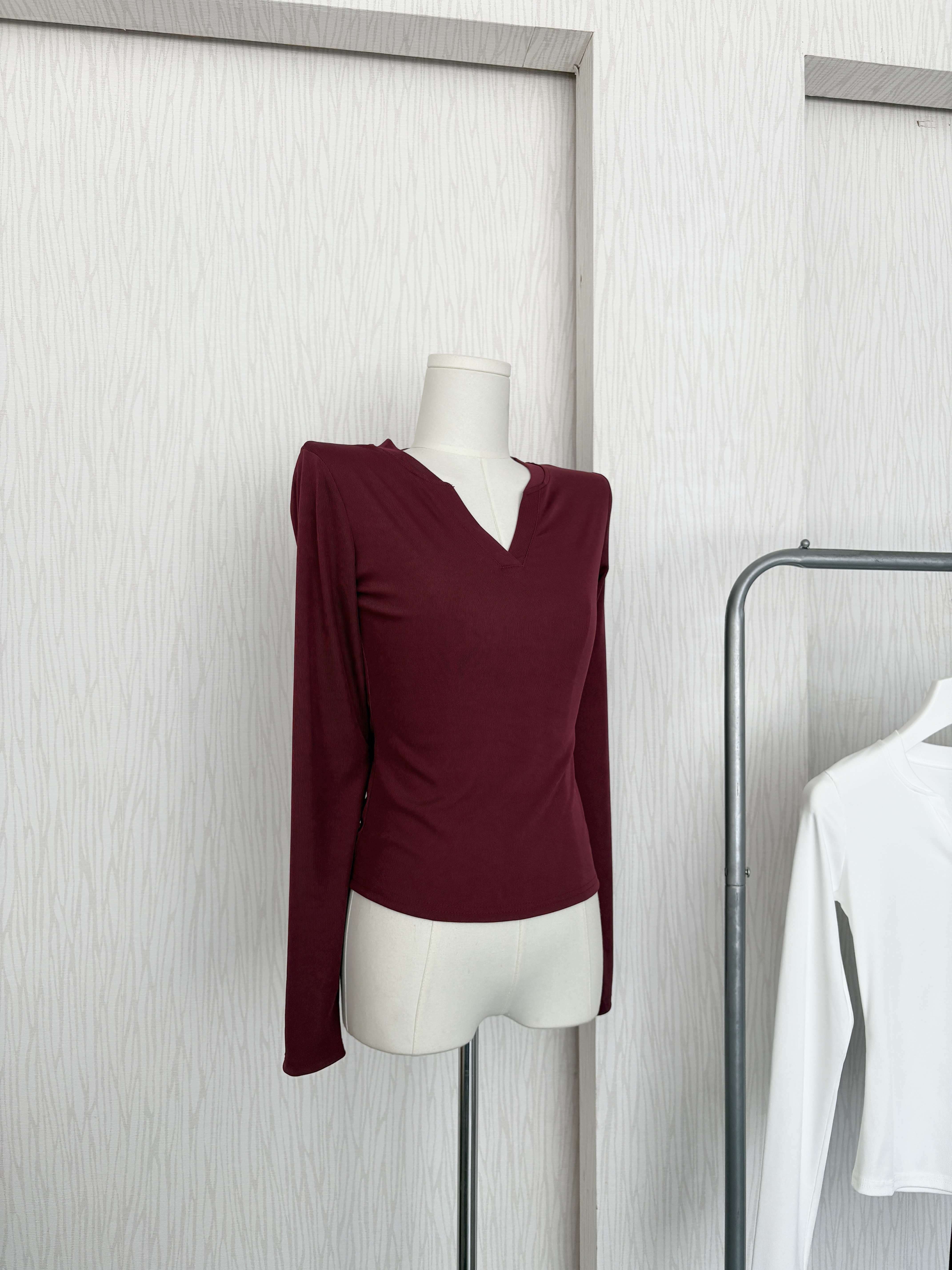 U領直坑紋超彈短版長袖上衣