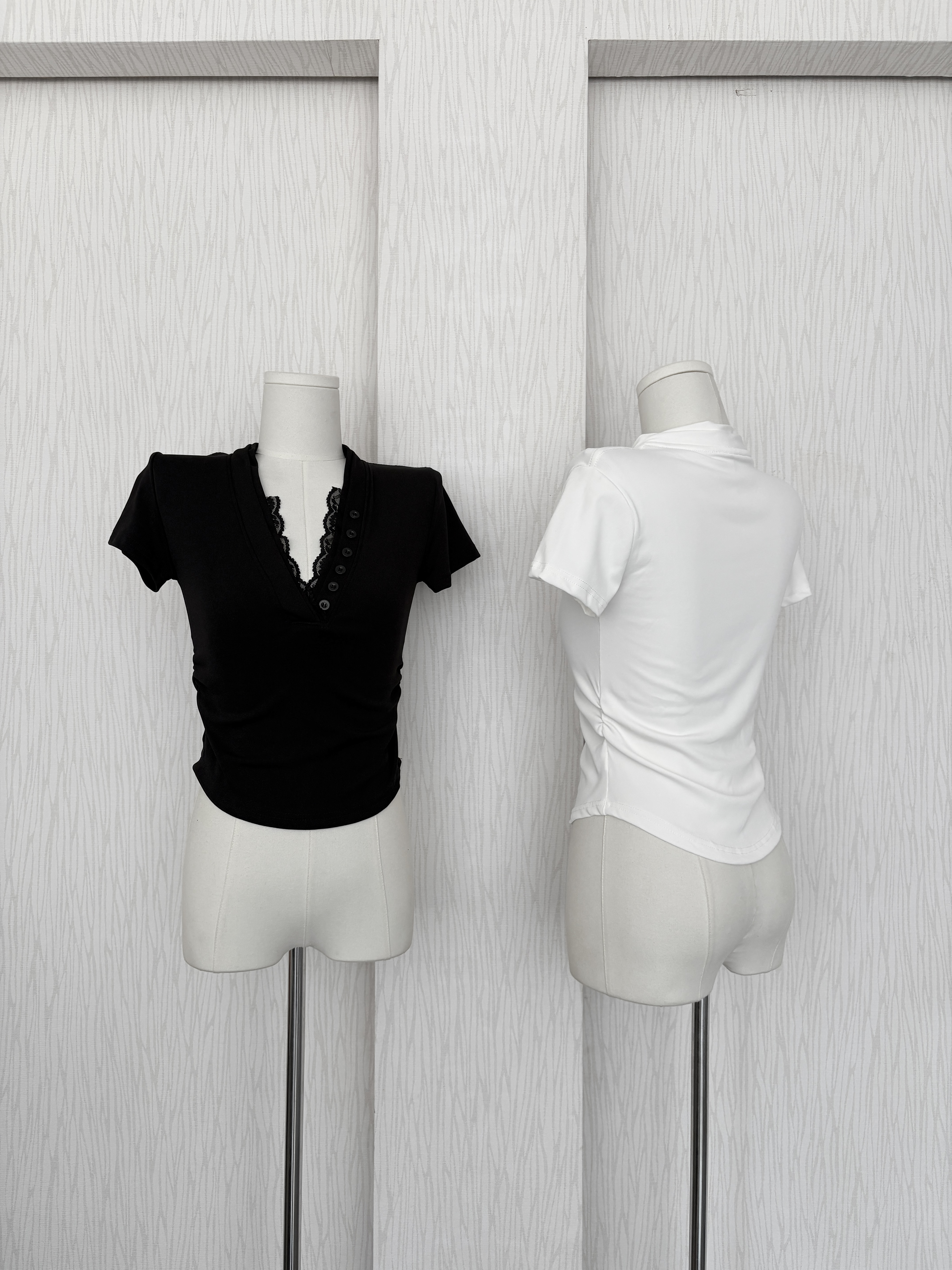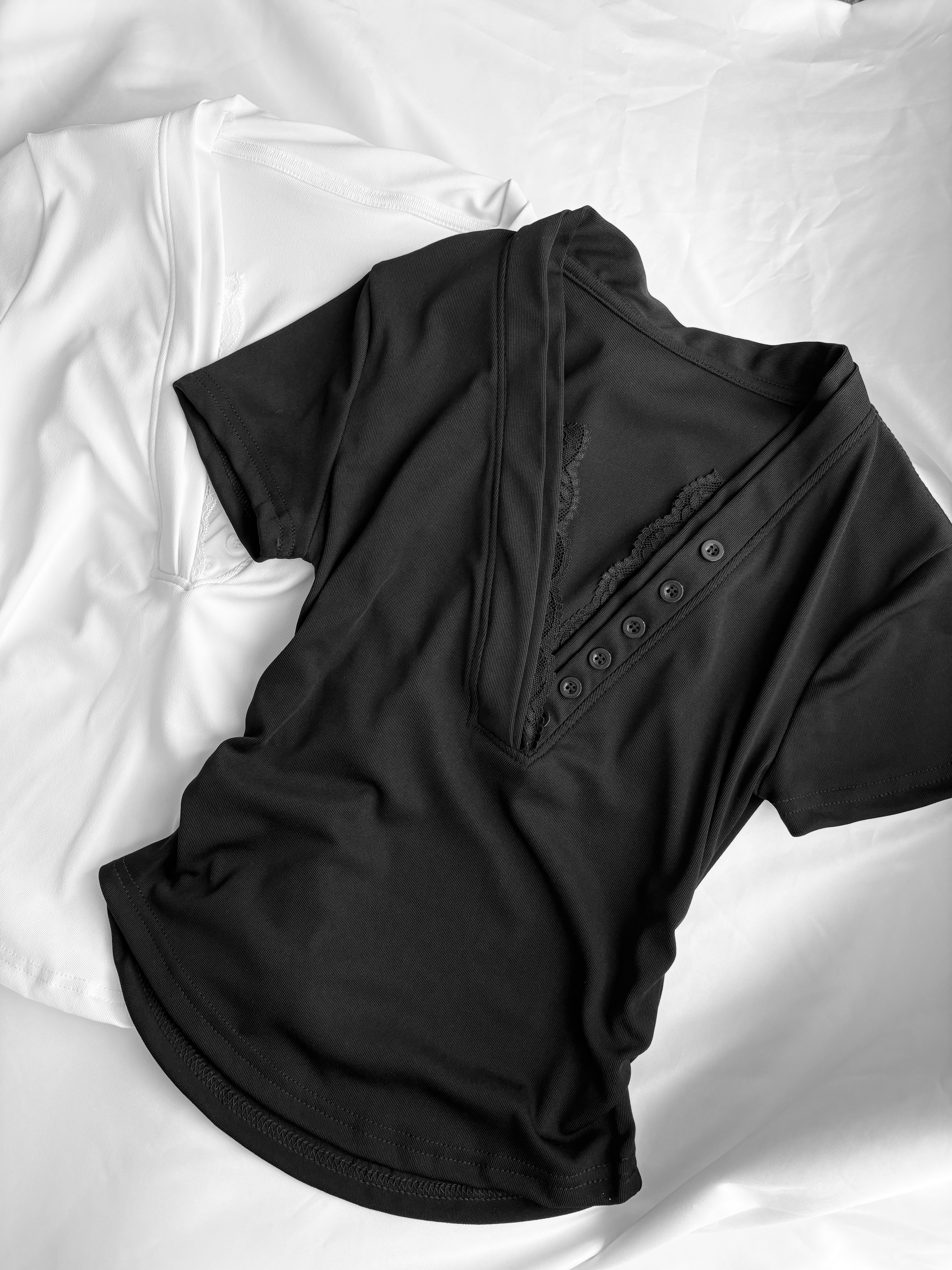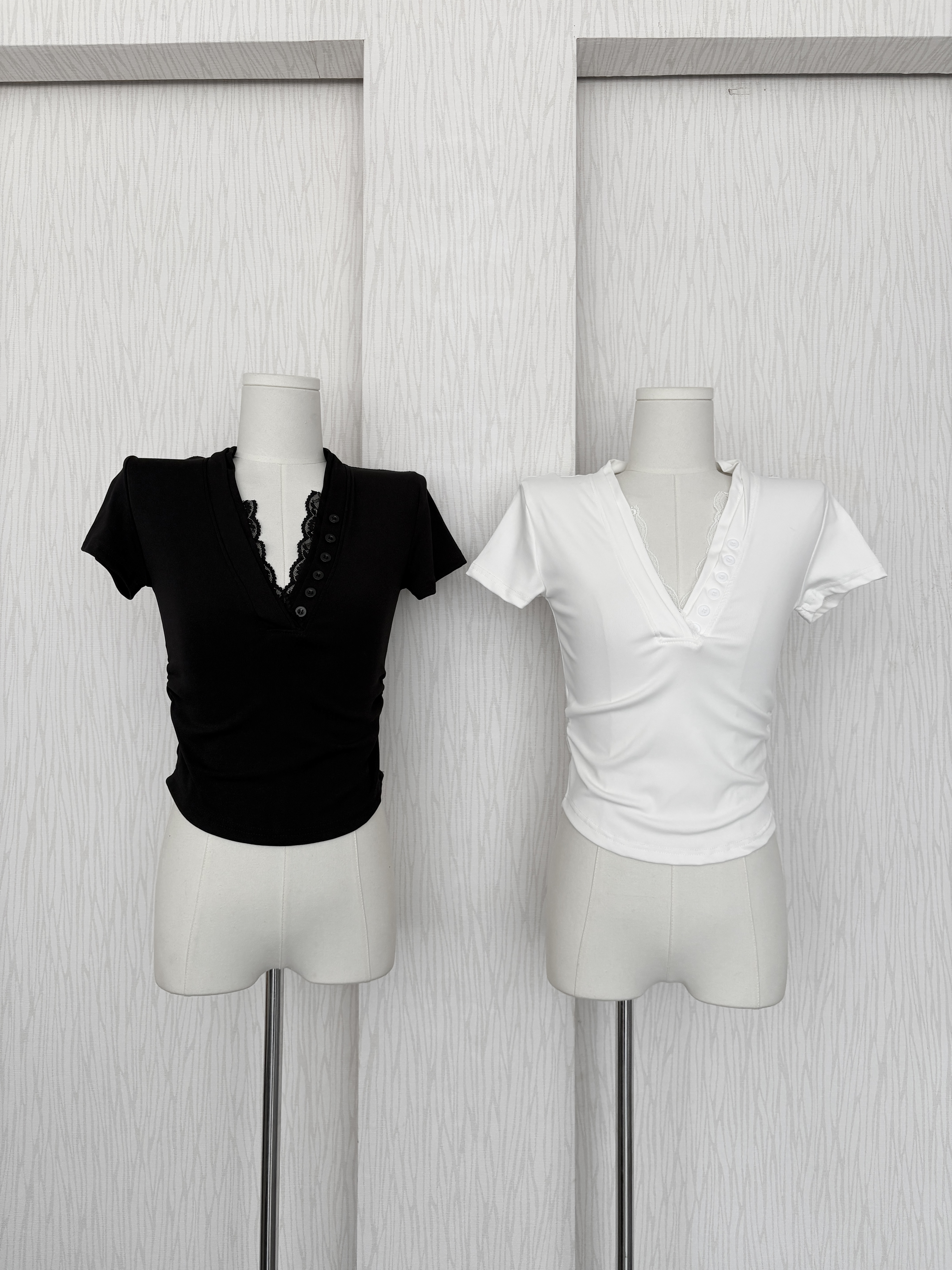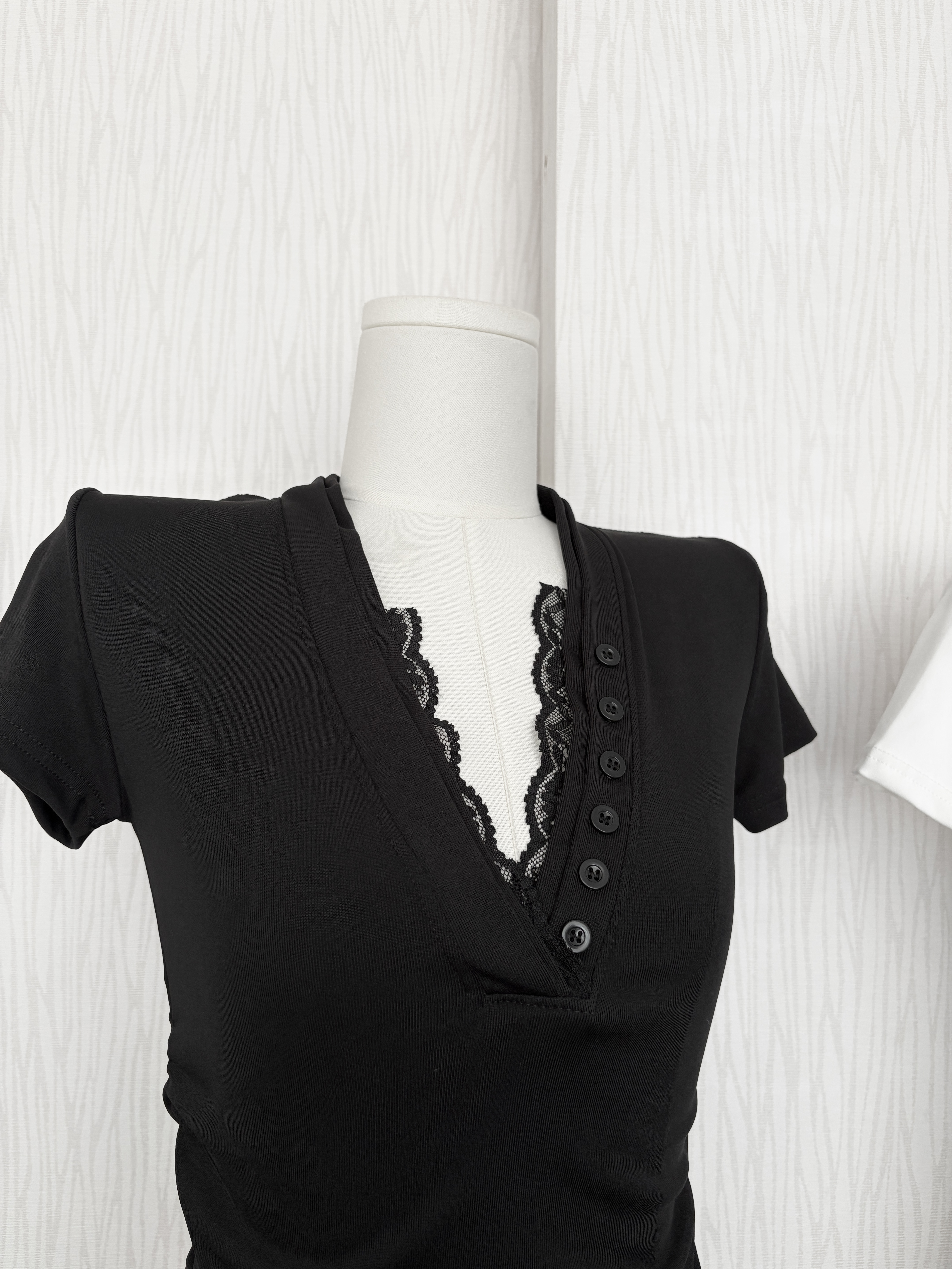 蕾絲排扣腰身下U短袖上衣