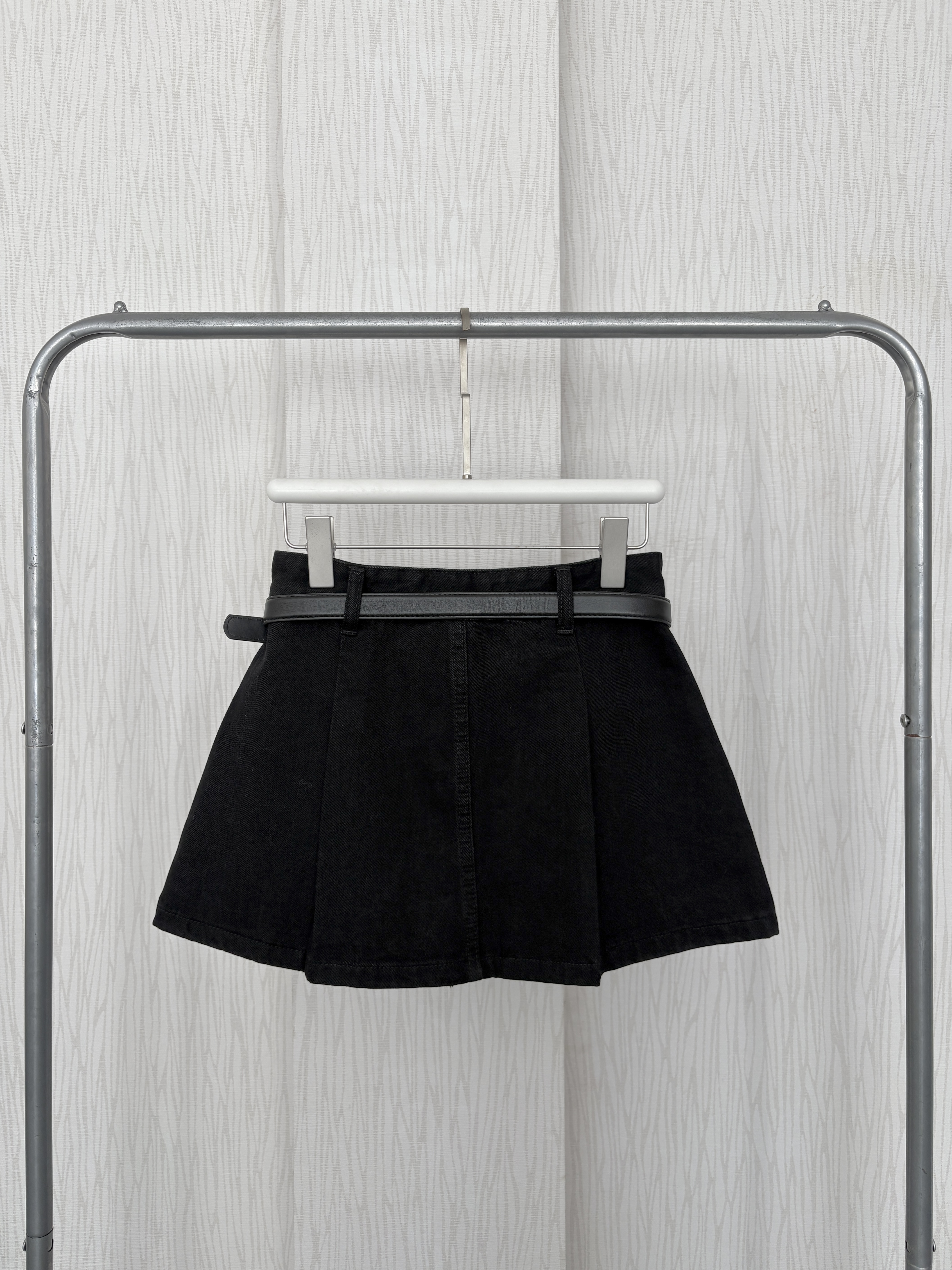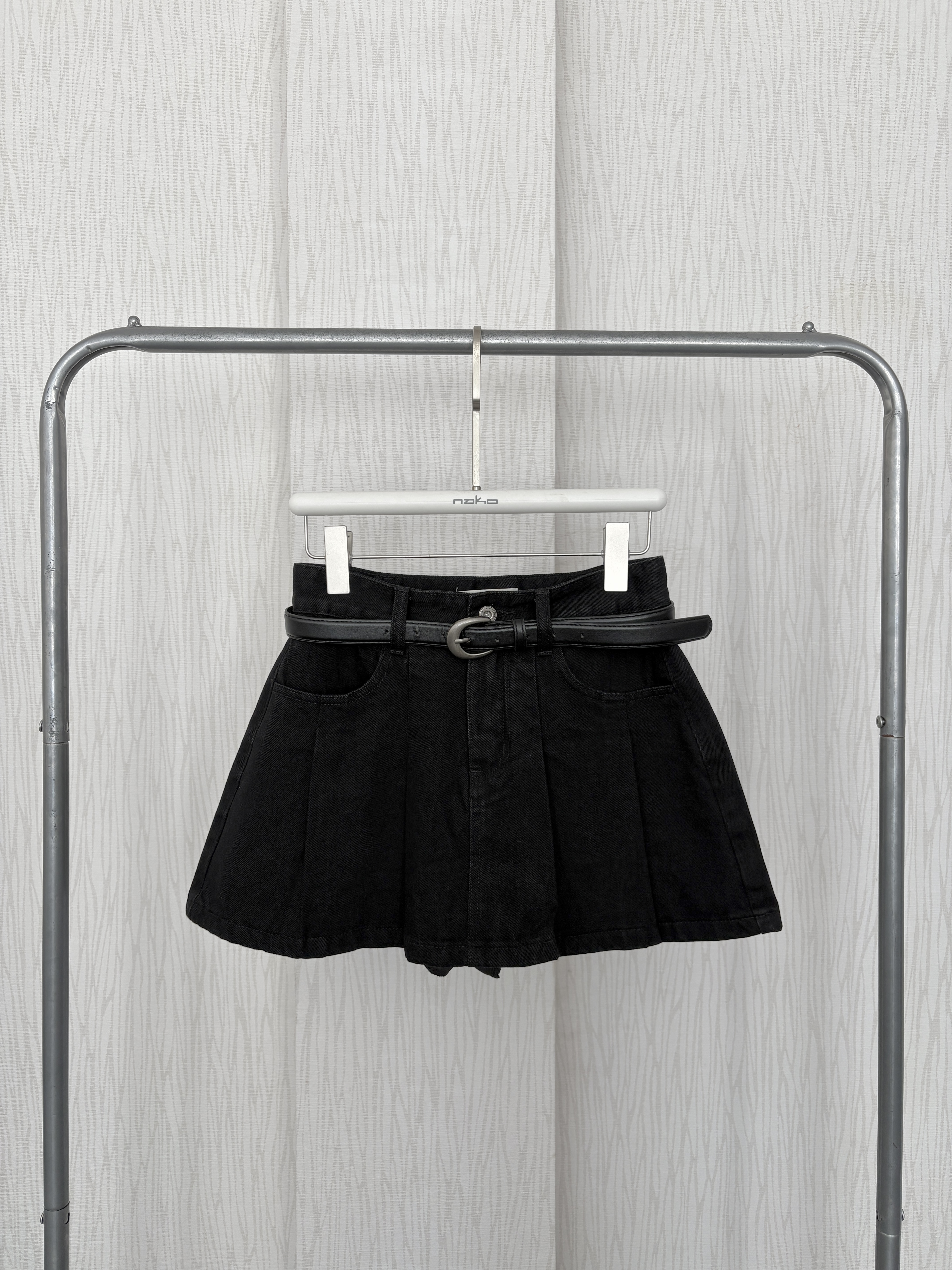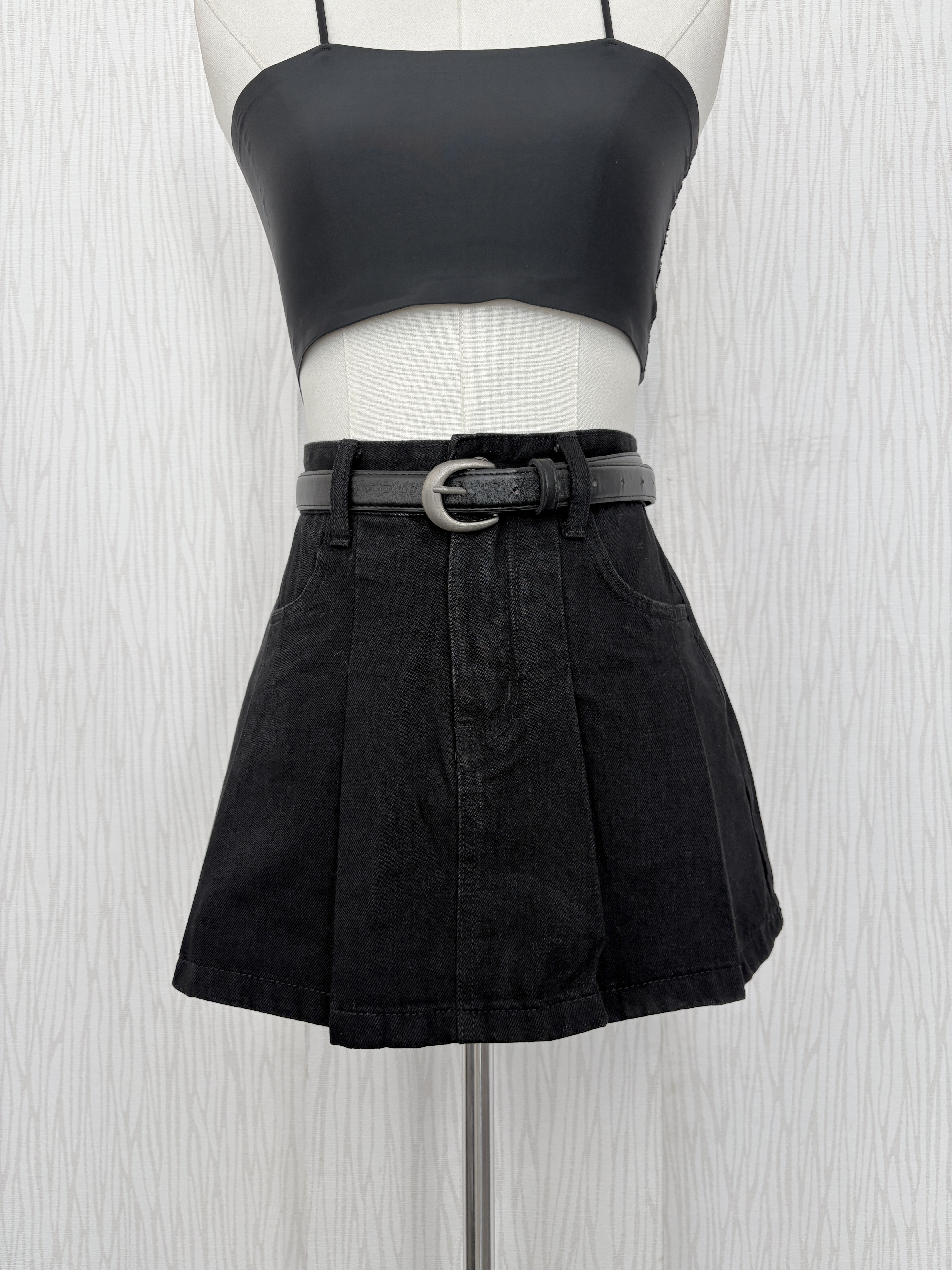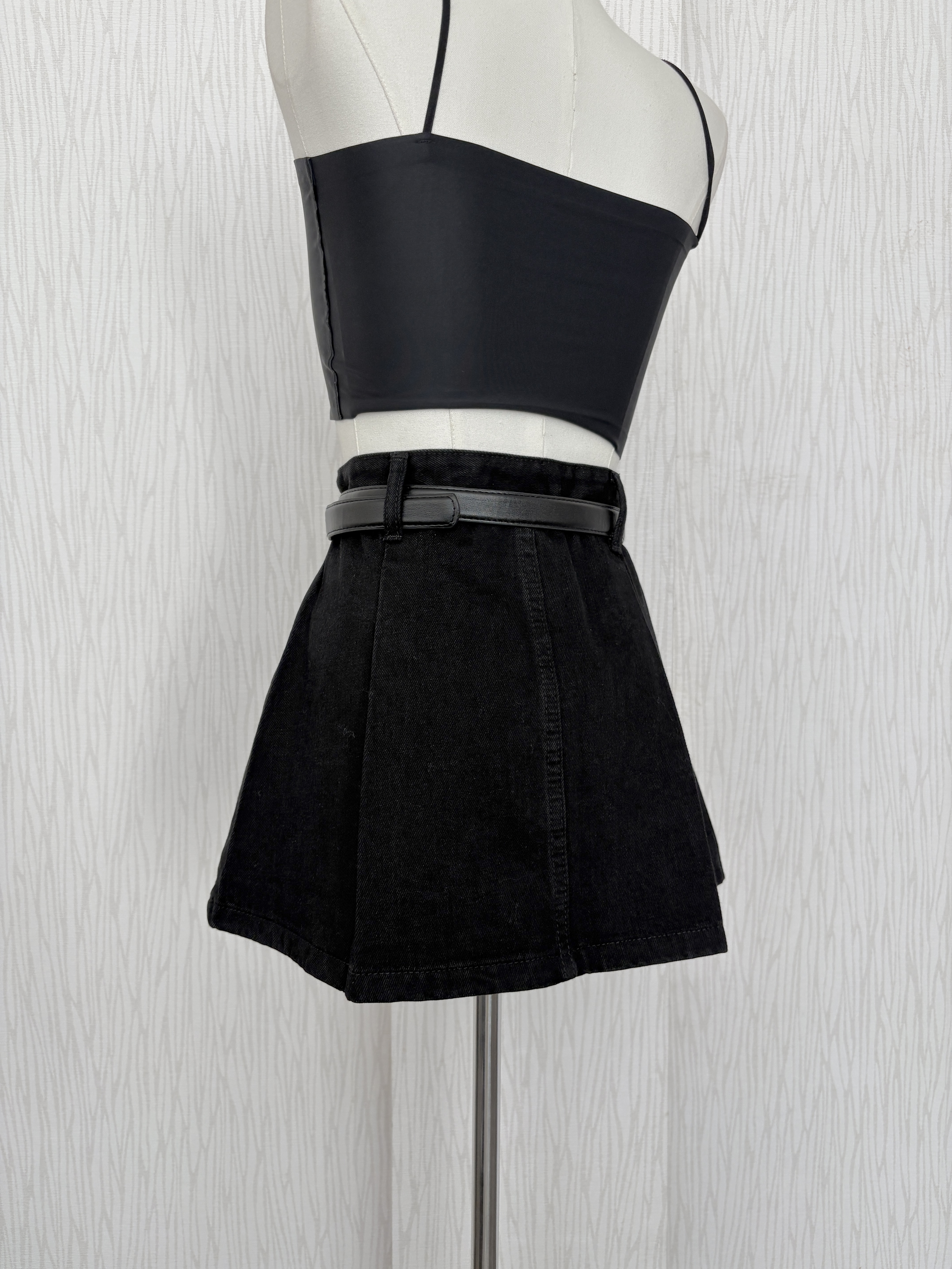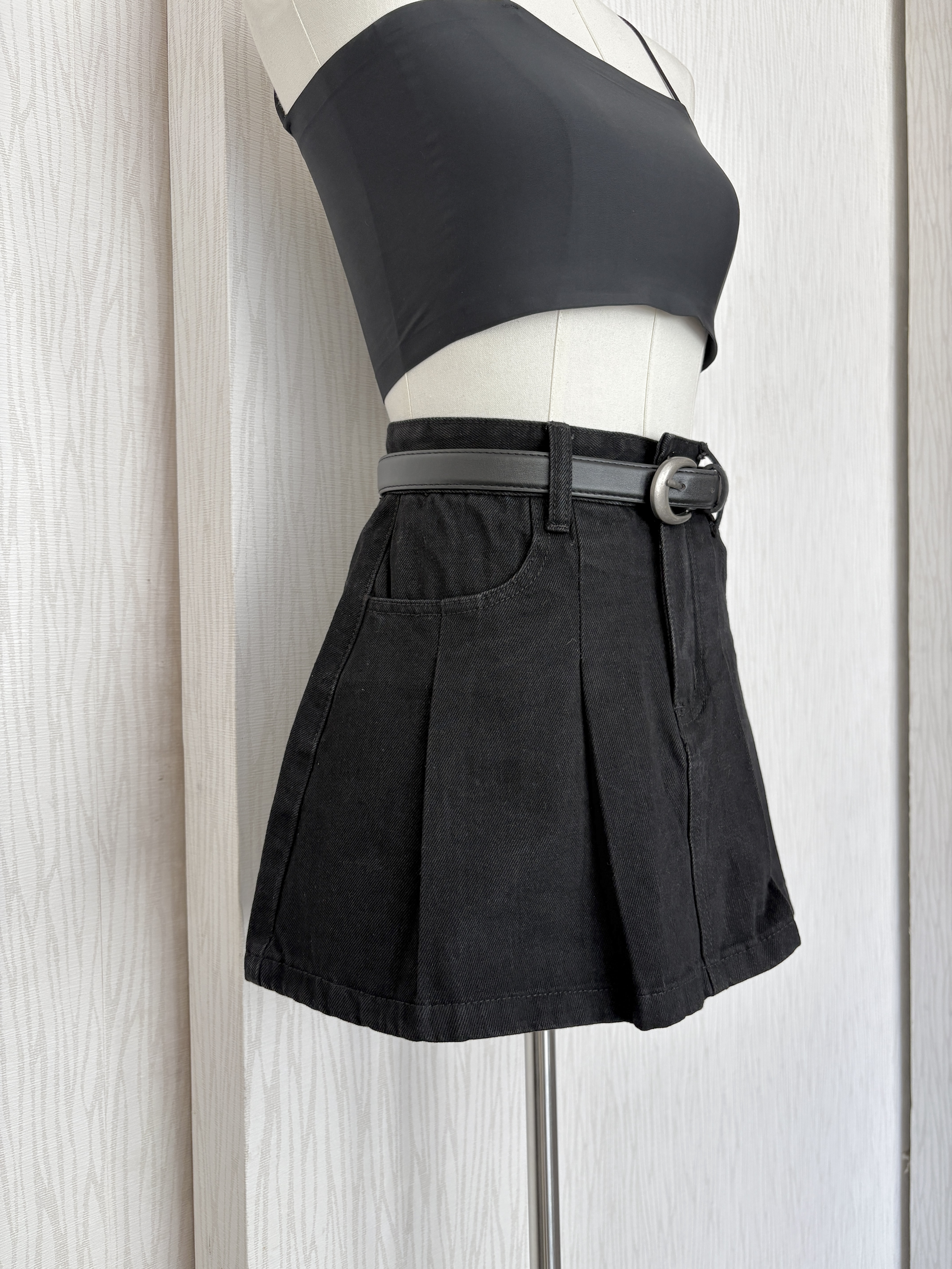 【現貨出清】黑百褶牛仔短褲裙(附皮帶)